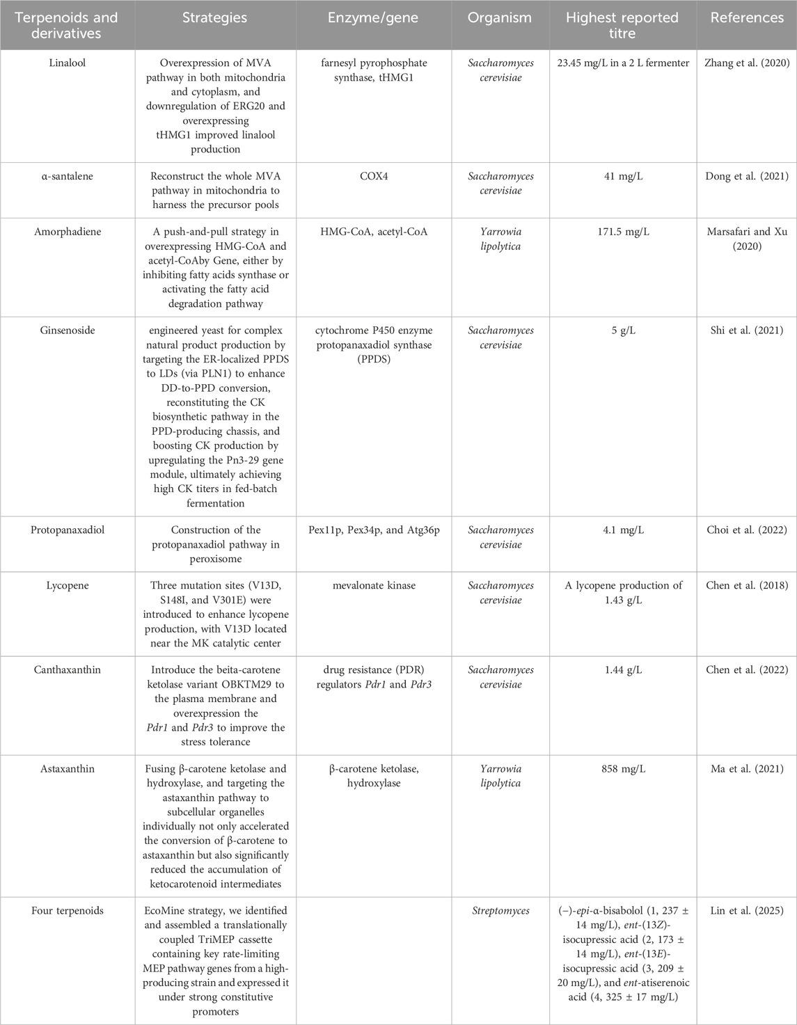 Although photosynthetic cyanobacteria exhibit limited carbon fixation capacity, their endogenous isoprenoid metabolic flux is remains inadequate, which limits the efficiency of terpenoid production. It is necessary to overexpress terpene synthase and key enzymes of the MEP pathway to improve the production of terpenoids. Notably, marine diatoms have demonstrated successfully expression of plant-derived metabolites, such as anti-HIV terpenoid botulinum toxin, facilitated by their simplified cellular architecture and well-established genetic manipulation platform (Ben David et al., 2022). Furthermore, the eukaryotic host yeast shows unique systemic advantages: its natural MVA pathway provides a stable metabolic framework for terpenoid precursor synthesis, while its endoplasmic reticulum machinery efficiently facilitates the proper folding of plant-derived cytochrome P450 and UbiA transmembrane proteins. These features have enabled the successful heterologous production of complex molecules such as ginsenosides.