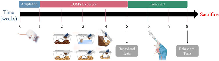 After 1 week of adaptation, rats were randomly divided into five groups, with six rats per group. The experimental groups are Control, Leek, CUMS, CUMS + Leek, and CUMS + Imipramine (Figure 1). Rats in the CUMS groups were housed individually to facilitate the induction of depressive-like symptoms using CUMS model according to previously described protocols (Abelaira et al., 2013; Tian et al., 2015). Over a 4-week period, the CUMS protocol involved daily exposure (in random order) to various stressors, which included: noise exposure for 3 h, water deprivation for 24 h, food deprivation for 24 h, immersion in cold water, social isolation, and reversal of the light/dark cycle. The treatment duration was 3 weeks, with oral administration once per day every morning. In the Leek and CUMS + Leek groups, leek extract [100 mg/kg, orally (p.o.)] was administered (Al-Otaibi et al., 2020). In the CUMS + Imipramine group, imipramine (10 mg/kg, p. o.) was administered (Berk et al., 2020). For the Control and CUMS groups, saline was administered during the same period.