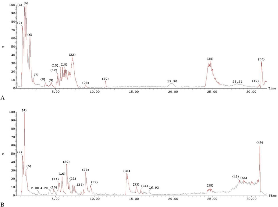 Figure 3. LC-MS/MS chromatograms of the phytochemical compounds in Allium ampeloprasum var. Kurrat leaves extract. (A) Positive ion acquisition mode, and (B) Negative ion acquisition mode.