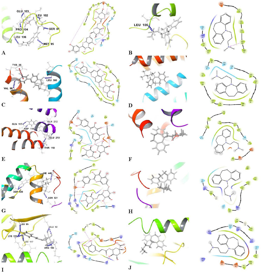 Figure 4. 3D molecular docking representations and 2D schematic view of docking Interactions of bioactive components in Egyptian leek and target proteins. (A) Quercetin-7-O-rutinoside-BDNF, (B) Imipramine-BDNF, (C) Luteolin 7-O-glucoside-5-HT1A, (D) Imipramine-5-HT1A, (E) Quercetin-7-O-rutinoside-GFAP, (F) Imipramine-GFAP, (G) Quercetin-7-O-rutinoside-Nrf2, (H) Imipramine-Nrf2, (I) Chlorogenic acid-NF-κB, and (J) Imipramine-NF-κB.
