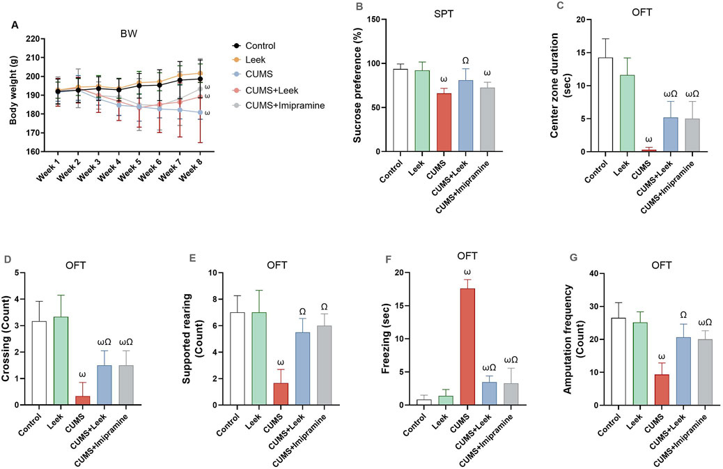 Figure 5. Body weight and behavioral assessments performed to evaluate the effects of CUMS exposure and leek treatment. (A) BW over 8 weeks, (B) SPT, (C) Center zone duration (sec) in the OFT. (D) Crossing in the OFT, (E) Supported rearing in the OFT, (F) Freezing (sec) in the OFT, and (G) Amputation frequency (squares crosses) in the OFT. Data are expressed as mean ± SEM (n = 6 rats/group). For statistical significance, ωP < 0.05, compared to Control group; ΩP < 0.05, compared to CUMS group (one-way ANOVA followed by Tukey’s test).