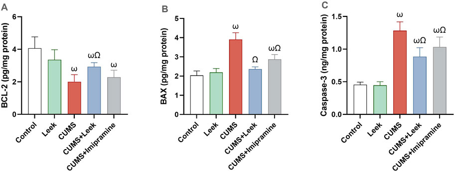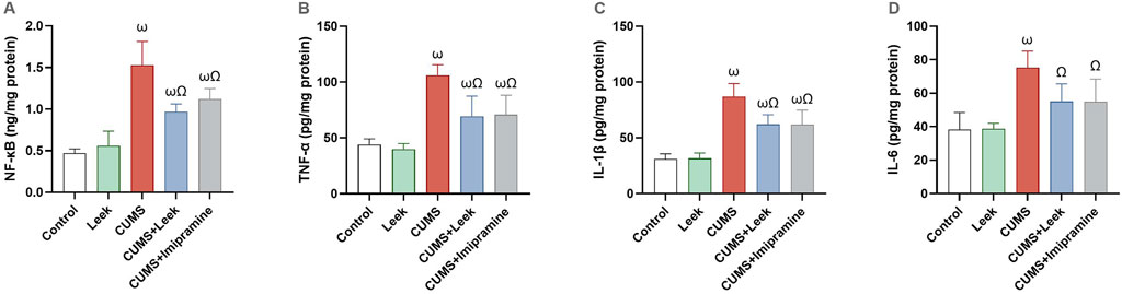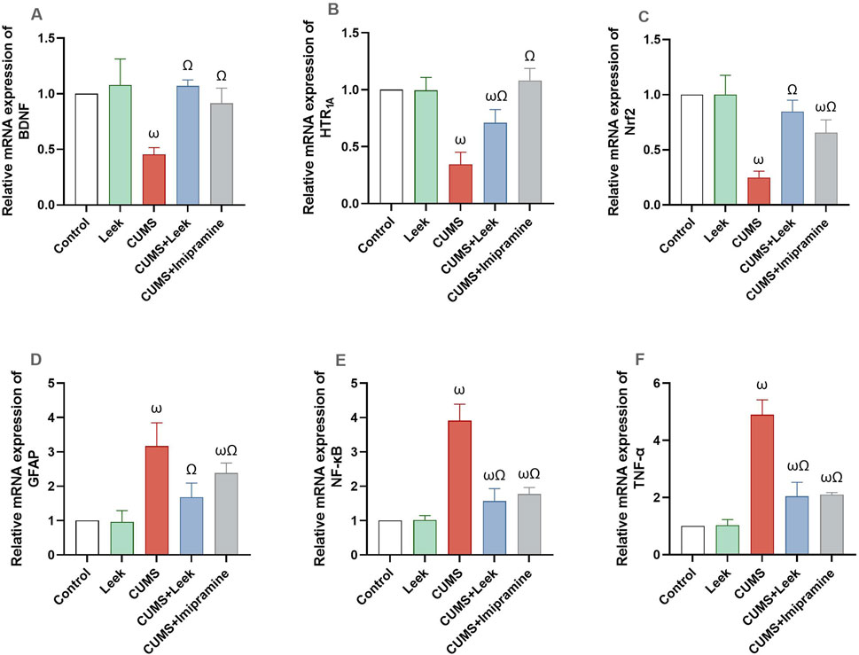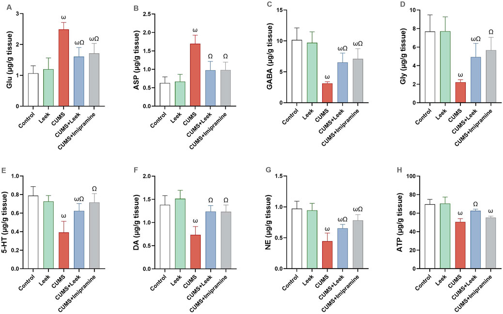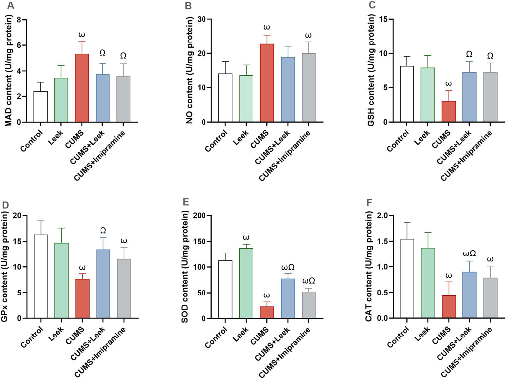 Changes in the body weight across the different groups of rats over the 8-week period were shown in Figure 5A. While no significant change in body weight was observed in the Control and Leek groups, all CUMS groups exhibited a significant reduction in weight after 4 weeks of CUMS induction in comparison to the Control group (ωP < 0.001). By the end of the experiment, all groups exhibited no significant increase in body weight.