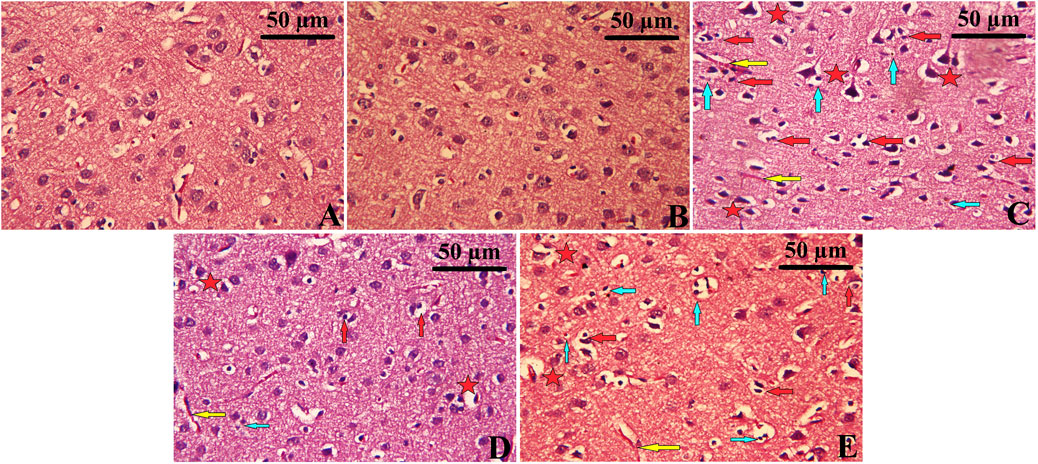 The hemisphere tissues were fixed in formalin (10%) overnight to preserve tissues architecture and cellular morphology. The tissues were then dehydrated in alcohol, embedded in high-quality paraffin wax, and sectioned into approximately 4 µm thick slices. Serial sections underwent xylene deparaffinization and graded alcohol rehydration before being stained with hematoxylin and eosin (H&E) for routine histology. The sections were subsequently examined under a Nikon Eclipse E200-LED microscope (Tokyo, Japan) at ×200 and ×400 magnification to assess histopathological changes in the cerebral cortex (El-Marasy et al., 2021).