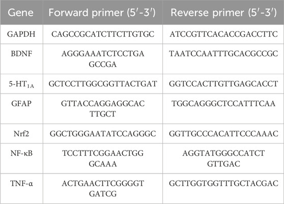 Total RNA was isolated from cerebral cortex tissue using TRIzol reagent (Invitrogen, Thermo Fisher Scientific). Subsequently, cDNA was obtained from the extracted RNA using a reverse transcription kit (Qiagen, Hilden, Germany). The qRT-PCR was conducted using the SYBR Green qPCR Master Mix kit (Qiagen, Hilden, Germany), and primers were obtained from Qiagen. The following genes were investigated for mRNA expression: BDNF, 5-HT1A, GFAP, Nrf2, NF-κB, and TNF-α, with glyceraldehyde-3-phosphate dehydrogenase (GAPDH) as the reference gene. Amplification and analysis were performed using an Applied Biosystems StepOne™ Real-Time PCR System with software version 3.1 (United States). Gene expression differences were evaluated using the 2−ΔΔCT method (Albrakati et al., 2021). Primer sequences detailed in Table 1.