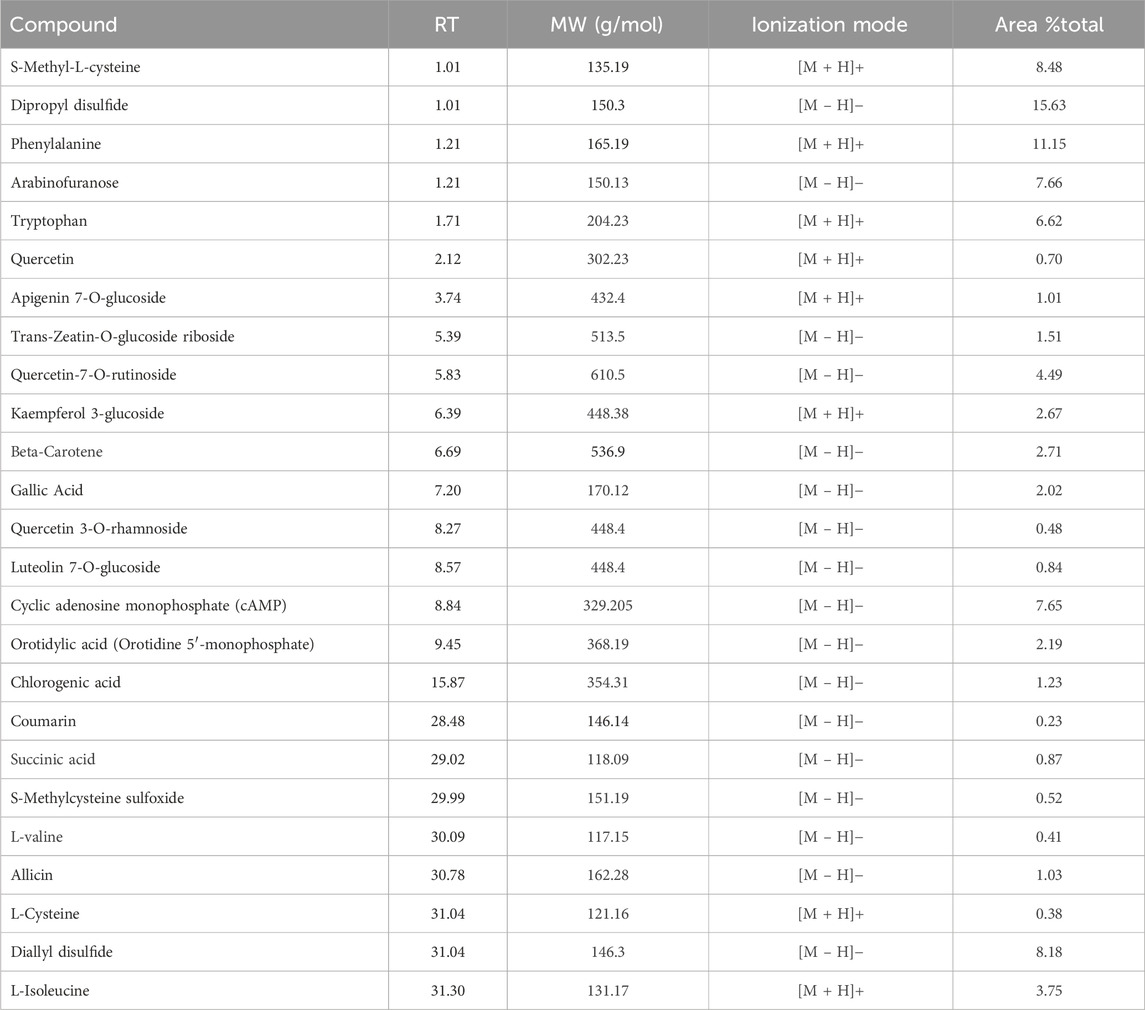 The LC-MS analysis of the Egyptian leek extract leaves revealed the presence of 26 distinct compounds (after eliminating unknown compounds), based on their unique fragmentation patterns, underscoring the extract’s rich bioactive profile (Figure 3). The analysis demonstrated that the leek extract is abundant in phytochemicals, with sulfur-containing compounds predominating, aligning with previous reports of sulfur’s bioactive properties in Allium species (Poojary et al., 2017). The phytochemicals were listed according to their retention time (Rt), as shown in Table 2.