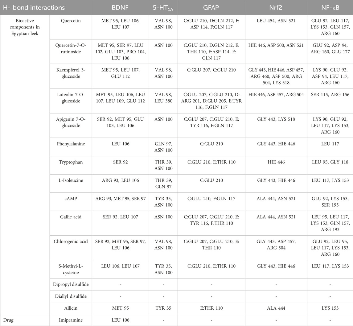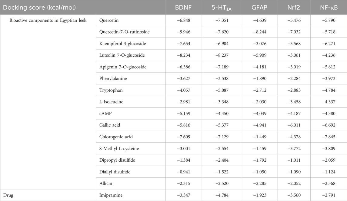 Molecular docking studies on the bioactive components in Egyptian leek demonstrated robust binding affinities and extensive hydrogen bonding interactions with key proteins implicated in depression and its related pathways. These proteins include BDNF, 5-HT1A, GFAP, Nrf2, and NF-κB (Tables 3, 4; Figure 4). Lower (more negative) docking scores indicate stronger binding interactions, and the analysis highlighted flavonoids as the most promising compounds. Quercetin-7-O-rutinoside had the highest affinity for BDNF with a docking score of −9.946 kcal/mol, forming six hydrogen bonds with the residues MET 95, SER 97, LEU 102, GLU 103, PRO 104, and LEU 106. For the 5-HT1A, Luteolin 7-O-glucoside recorded the highest binding affinity (−8.237 kcal/mol), and interacted with the receptor through two hydrogen bonds involving VAL 98 and LEU 380. Quercetin-7-O-rutinoside again exhibited stronger binding to GFAP (−8.244 kcal/mol; six hydrogen bonds) and Nrf2 (−7.032 kcal/mol; four hydrogen bonds). Other flavonoids, such as quercetin, kaempferol 3-glucoside, and apigenin 7-O-glucoside, demonstrated strong binding across multiple targets, with extensive hydrogen bonding to critical residues (for example, quercetin with MET 95, LEU 106, LEU 107 in BDNF). Chlorogenic acid emerged as the strongest binder to NF-κB, with a docking score of −7.845 kcal/mol and formation of seven hydrogen bonds with residues GLU 92, LEU 95, LEU 117, LYS 153, and ARG 160. In contrast, sulfur-containing compounds such as diallyl disulfide, dipropyl disulfide and allicin showed weak binding affinities (with scores near zero or only slightly negative) and did not form any hydrogen bonds, except for allicin, which formed a single hydrogen bond with each target protein. Imipramine showed moderate binding affinities ranging from −1.923 to −7.048 kcal/mol and primarily formed limited hydrogen bonds with BDNF (notably with LEU 106). Notably, the flavonoids derived from leek outperformed imipramine in both binding strength and interaction complexity.