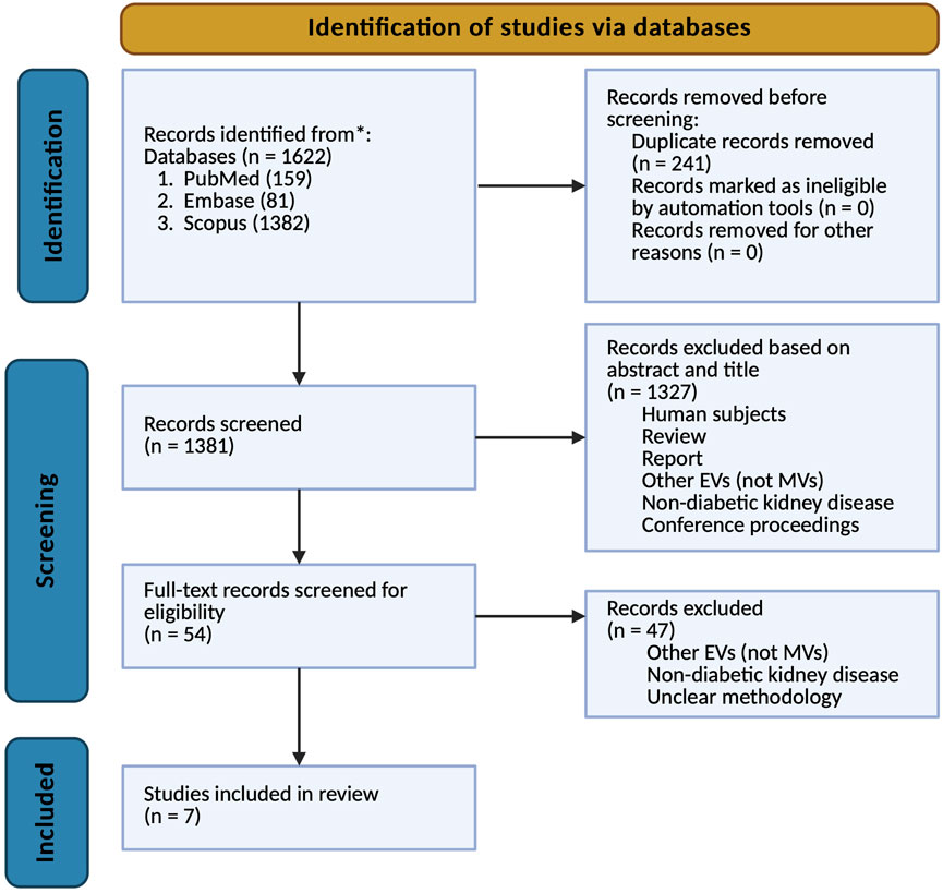The systematic review process was conducted in accordance with the PRISMA (Preferred Reporting Items for Systematic Reviews and Meta-Analyses) guidelines, as illustrated in Figure 1. A comprehensive search of relevant databases was performed to identify preclinical studies meeting predefined inclusion and exclusion criteria. The initial search yielded 1,622 articles, of which 241 were identified as duplicates and subsequently removed. Following the initial screening of titles and abstracts, 1,327 publications were excluded based on various reasons, including human studies, review papers, other EVs studied, non-diabetic kidney disease, and solely diabetes with no nephropathy. The remaining 54 articles underwent full-text evaluation, resulting in the exclusion of an additional 47 studies for similar reasons – other EVs, non-diabetic kidney disease, and unclear methodology. Ultimately, seven studies met all criteria and were included in the final analysis of this systematic review. This rigorous selection process ensured that only the most relevant and methodologically sound studies were incorporated into our analysis, thereby enhancing the reliability and validity of our findings.