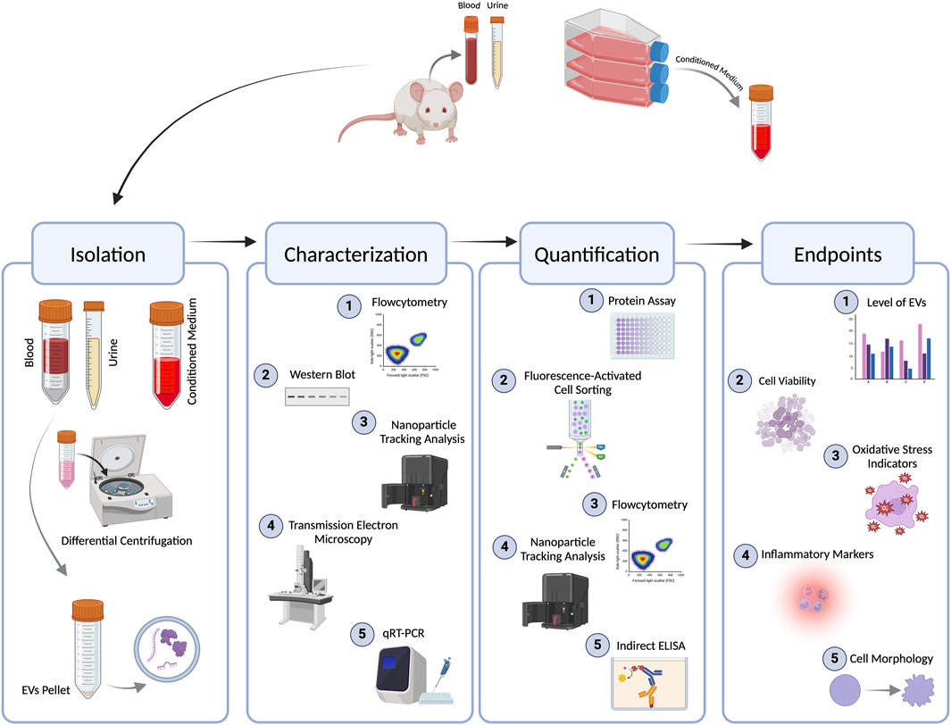 EVs are commonly categorized into three subtypes depending on their size (from smallest to largest): small-sized EVs (sEVs) or exosomes, and large-sized EVs (lEVs), which include microvesicles (MVs), large ectosomes, and apoptotic bodies (Welsh et al., 2024). This nomenclature is of an operational nature as it is based on a physical characteristic such as size. sEVs have a size of <200 nm, while lEVs have a size of >200 nm. Each subtype is released by a different mechanism; sEVs are released through the endosomal pathway, while lEVs are released by direct budding from the plasma membrane, and both can contain versatile cargo from the cell’s cytoplasm (Agouni et al., 2014; El-Gamal et al., 2019; Zaborowski et al., 2015). Despite the recommendations of the ISEVs, research publications continue to use outdated and inaccurate terminology. Methods for isolating and characterizing EVs are crucial for comprehending their biological roles and possible applications. Common techniques for isolating EVs include differential ultracentrifugation (dUC), which separates EVs by density; precipitation methods that use specific reagents to aggregate EVs; and size-exclusion chromatography, which sorts EVs based on size. More recent methods, such as microfluidic devices and immunoaffinity capture, enhance specificity and yield. Once isolated, characterization typically involves techniques like nanoparticle tracking analysis (NTA) to measure size and concentration, flow cytometry (FCM) for surface marker identification, and electron microscopy (EM) for morphological analysis. Additionally, proteomic and lipidomic studies provide important insights into the molecular composition of EVs, revealing potential biomarkers and functional characteristics (Agouni et al., 2014; El-Gamal et al., 2019).