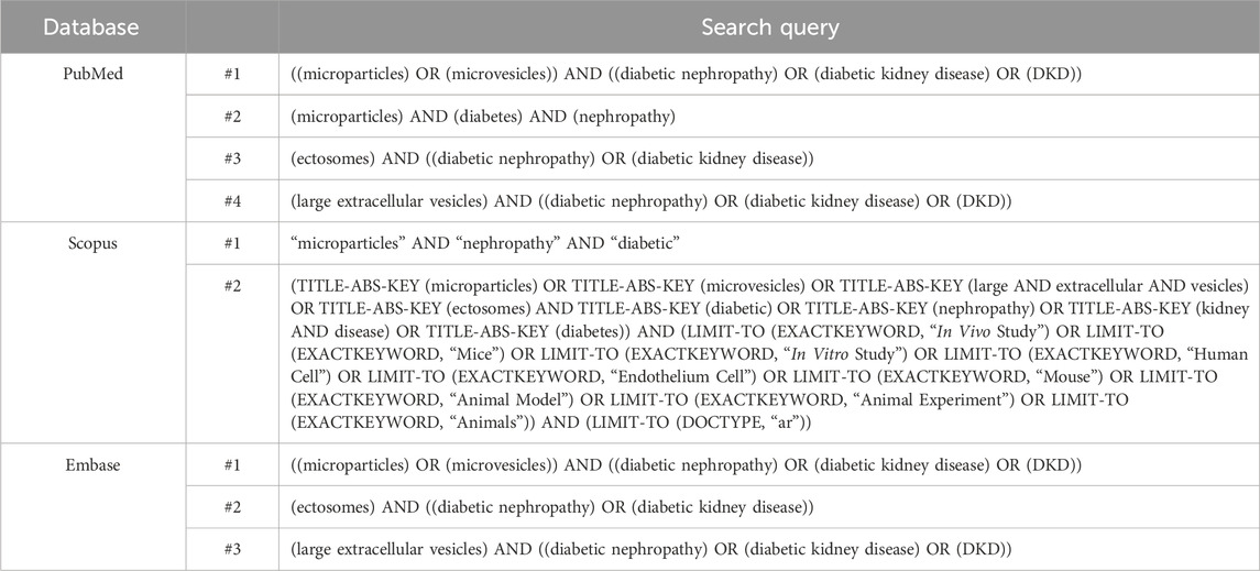 EVs have been studied extensively in DN and continue to be a prominent research focus in the field (Tao et al., 2020). Diabetes-induced EVs harness several signaling pathways that contribute to the deterioration of kidney function; for example, encapsulating transforming growth factor beta (TGF-β), mediating its downstream signaling cascade on different kidney cell types (Lu et al., 2020), and mediating endothelial dysfunction through ER-induced cellular stress (Safiedeen et al., 2017; Osman et al., 2020). Research has pinpointed specific EV cargo that indicate renal injury and inflammation, suggesting they could serve as biomarkers for early diagnosis and monitoring disease progression. Some of these discovered biomarkers include microRNA (miR)-21 (Ding et al., 2021), and alpha1-antitrypsin (Ning et al., 2020). Despite the eminent scientific publications on the topic, there remains much to be explored. Overall, the exploration of EVs in DN provides important insights into the disease mechanisms and possible intervention strategies. Several systematic reviews have examined EVs in the context of DN, with an exclusive focus on studies involving human subjects. However, to our knowledge, this is the first systematic review that summarizes and discusses preclinical studies investigating the large-sized EV subset, MVs, in DN.
