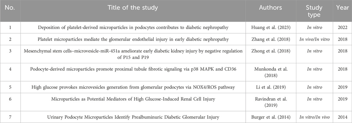 Table 5. A summary of the experimental methods and assays employed by the included studies to assess the association of MVs with various DN endpoints.