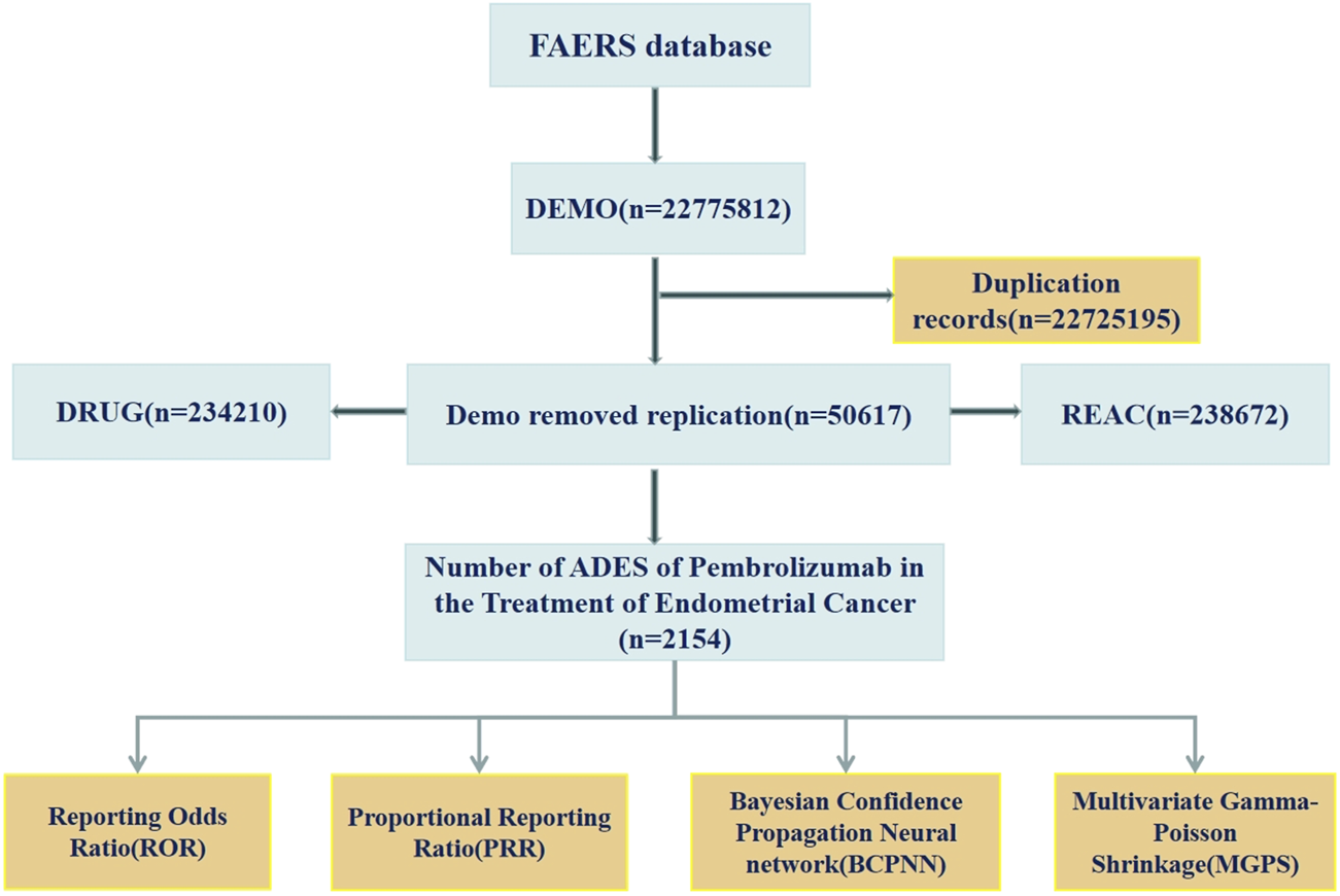 The database includes a role cod field in the DRUG table to identify genuine “drug-adverse event” signals. The role cod is classified into four categories: PS (primary suspected drug), SS (secondary suspected drug), C (concomitant), and I (interaction). In this study, we identify cases in the DRUG file using the generic name (Pembrolizumab) of the drug and select the role cod as PS to improve accuracy. Additionally, to further limit the indications, we restrict the indication to endometrial cancer. To reduce the false positive rate, we apply the proportional imbalance measurement method to mine true “drug-adverse event” signals.