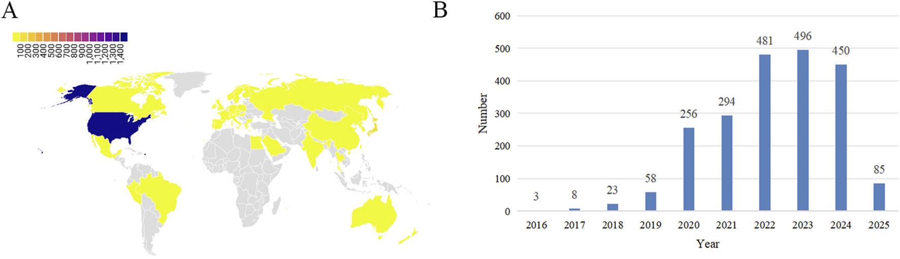 Basic information on ADEs related to the use of pembrolizumab in EC. (A) Distribution of ADEs by country; (B) Distribution of ADEs by year.