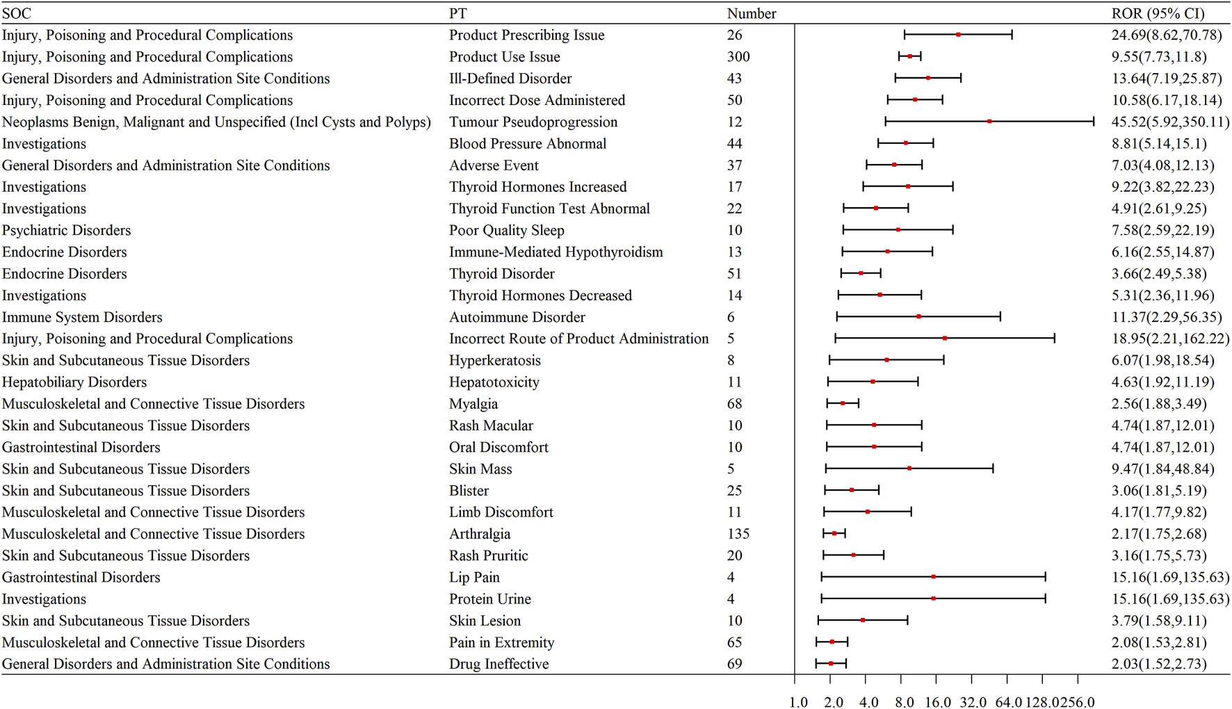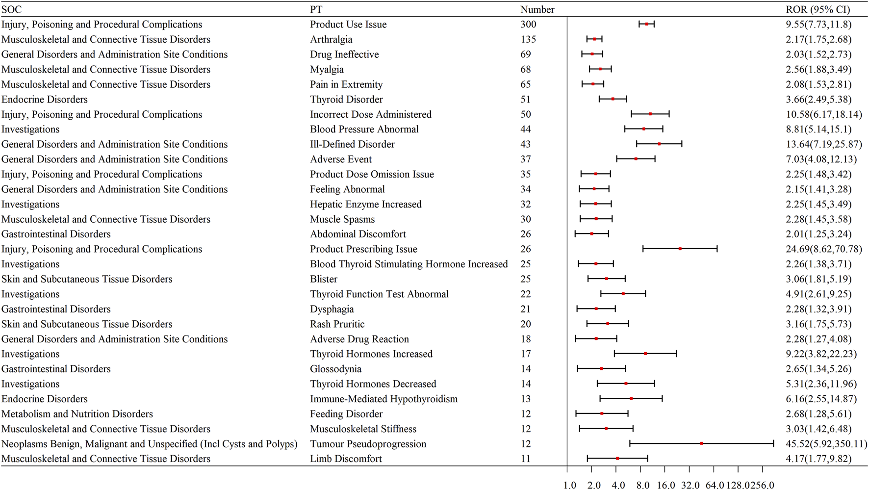 To enhance the representativeness of ADE signals, we selected the top 30 PTs based on their frequency and ROR values. Musculoskeletal and connective tissue disorders were particularly prominent, including Arthralgia (ROR = 2.17), Myalgia (ROR = 2.56), Pain in Extremity (ROR = 2.08), Musculoskeletal Stiffness (ROR = 3.03), and Limb Discomfort (ROR = 4.17). Endocrine system disorders also featured heavily, such as Thyroid Disorder (ROR = 3.66), Abnormal Thyroid Function Test (ROR = 4.91), Increased Thyroid Hormones (ROR = 9.22), and Immune-Mediated Hypothyroidism (ROR = 6.16). Other frequent signals included Pruritic Rash (ROR = 3.16), Blisters (ROR = 3.06), and Increased Hepatic Enzymes (ROR = 2.25) (Table 5; Figure 3).