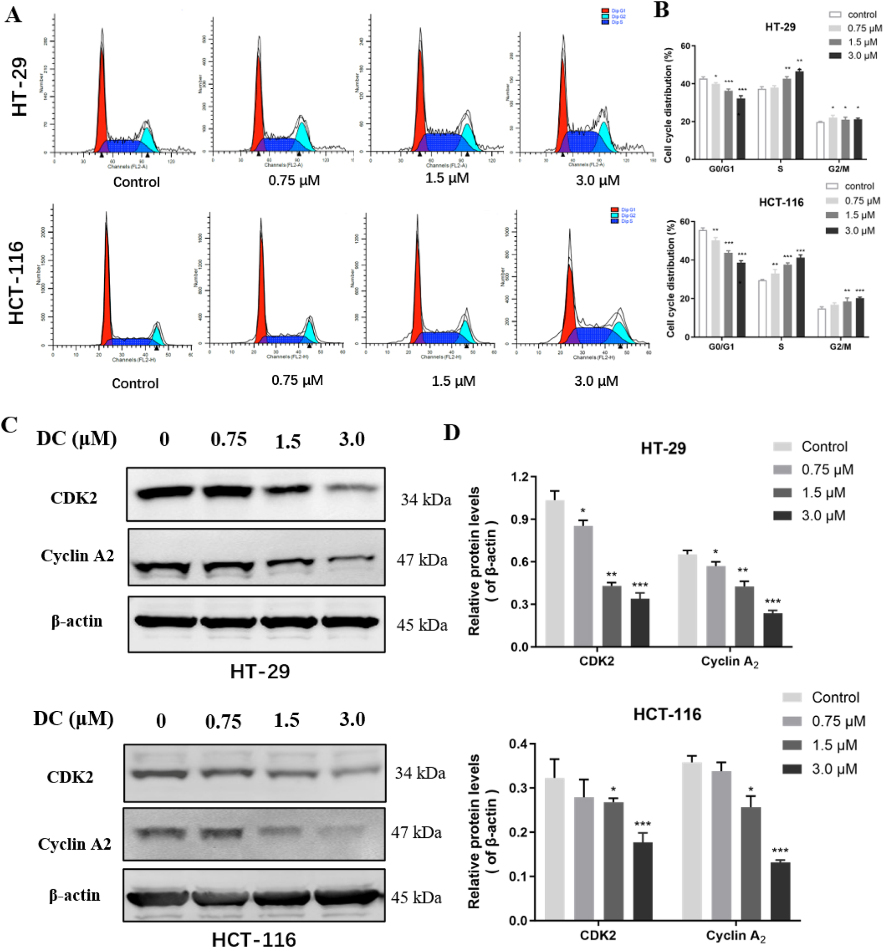 DC treatment arrested cell cycle at the S phase and regulated the expression of related proteins in colon cancer cells. (A) HT-29 and HCT-116 cells were treated with DC for 24 h. The cells were fixed and stained by PI to analyze the cell cycle distribution using a flow cytometer. (B) Quantification of the cell cycle distribution of HT-29 and HCT-116 cells. (C,D) The expression of CDK2 and Cyclin A2 followed treatment with DC for 24 h by Western blotting. Data are expressed as the mean ± S.D. of three independent experiments. Significance was determined by the one-way ANOVA (***P < 0.001, **P < 0.01, *P < 0.05 vs. control).