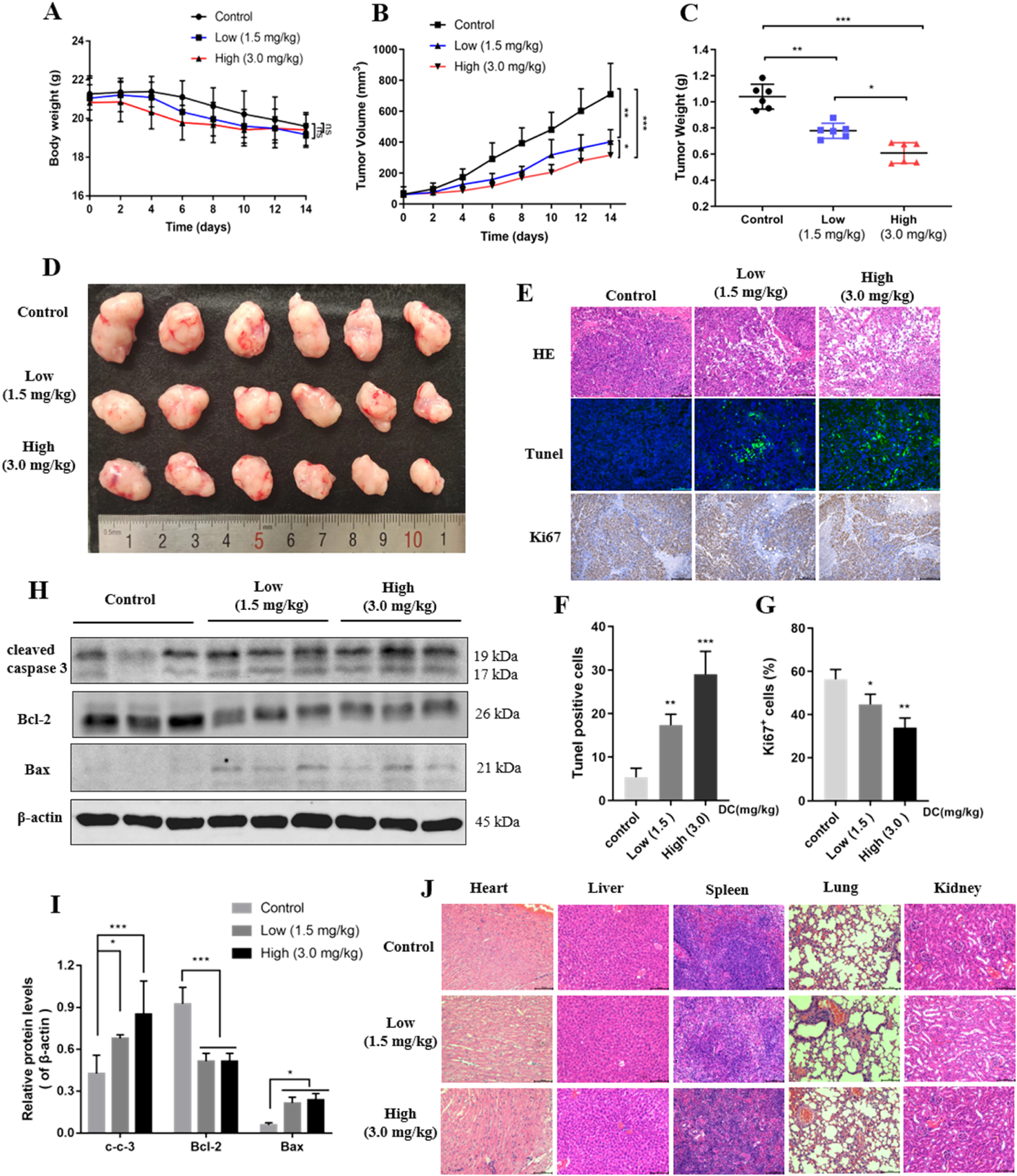 DC suppressed tumor growth in HT-29 cell xenograft mice. HT-29 cells were subcutaneously injected into the right flanks of nude mice, and saline or DC was administrated intraperitoneally daily for 14 days. (A) Time course of body weight (n = 6). (B) Time course of tumor growth progression (n = 6). (C) Tumor weight measured at the end of the experiment (n = 6). (D) Images of the excised tumors at the end of the experiment. (E) Tumor sections were subjected to HE, tunel and immunohistochemistry staining for Ki67. (F,G) The cell number of tunel and ki67 were quantitatively analyzed. (H) The relative protein expression levels of cleaved-caspase 3, Bcl-2, Bax compared to β-actin in the tumor tissues. (I) Detection of apoptosis related proteins by Western blot analysis. (J) Hearts, livers, spleens, lungs, and kidneys were stained with H&E. Data are expressed as the mean ± S.D. of three independent experiments. Significance was determined by the one-way ANOVA (***P < 0.001, **P < 0.01, *P < 0.05 vs. control).