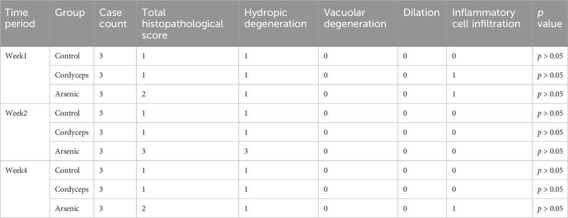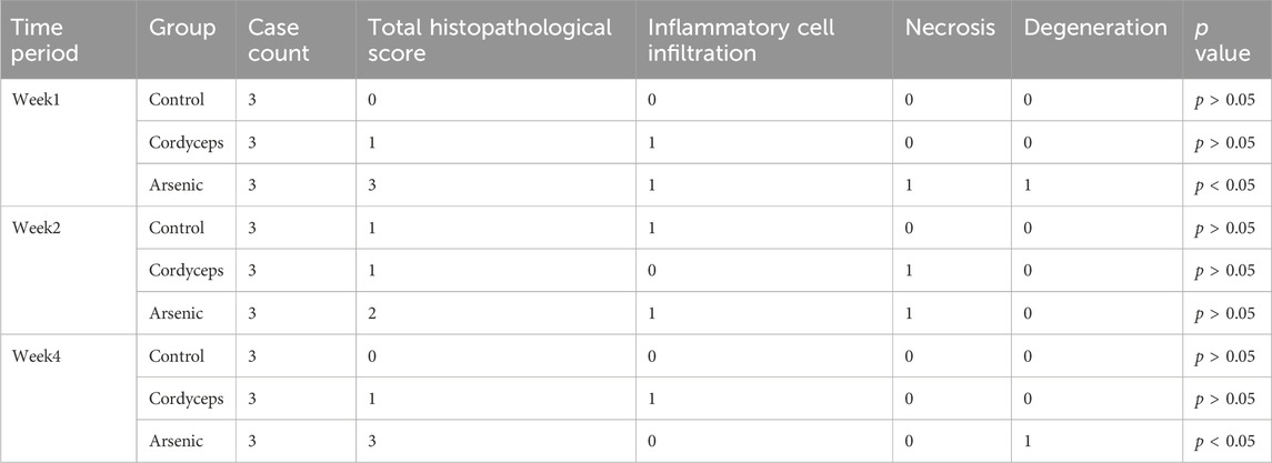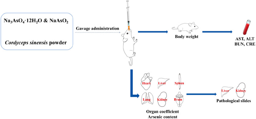 Result: Compared with those in the control group, no significant adverse effects on body weight, organ indices, arsenic accumulation, liver or kidney function, or liver or kidney pathology were observed in the Cordyceps group. In contrast, inorganic arsenic exposure resulted in significant arsenic accumulation in organs, especially in the liver and kidneys (p < 0.01), liver and kidney function impairment (p < 0.01), and pathological changes, including hepatic steatosis, mild edema, balloon degeneration, and renal tubular epithelial cell edema and degeneration, with the aggregation of eosinophils in the renal capsule.