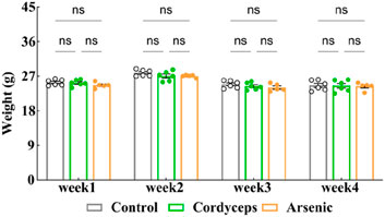 Changes in body weight are among the commonly used physiological indicators for assessing the impact of a drug on mouse health and can be utilized to evaluate potential toxicological responses (Sellers et al., 2007). Because the inorganic arsenic present in wild Cordyceps sinensis (C. sinensis) may affect weight changes in mice, to investigate the differences in the influence of wild C. sinensis containing inorganic arsenic versus an equivalent dose of inorganic arsenic alone on body weight in mice, we monitored changes in body weight during the administration period. The results revealed that the weight changes in the three groups of mice followed a similar trend (Figure 2). The body weights of the mice in the Cordyceps group decreased by 0.004%, 0.029%, 0.019%, and 0.004% in the first, second, third, and fourth weeks of administration, respectively. In the arsenic group, the body weight decreased by 0.025%, 0.028%, 0.029%, and 0.011% at the first, second, third, and fourth weeks, respectively (Fig. S-1). No statistically significant differences in body weight changes were observed between the two groups and the control group. The experimental results indicate that treatment with wild C. sinensis had no impact on mouse body weight. Similarly, exposure to inorganic arsenic at equivalent doses had no influence on mouse body weight.