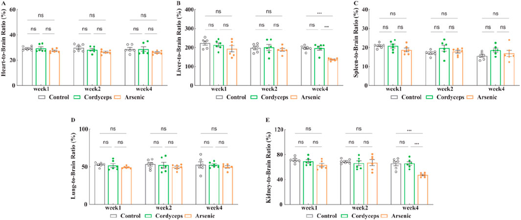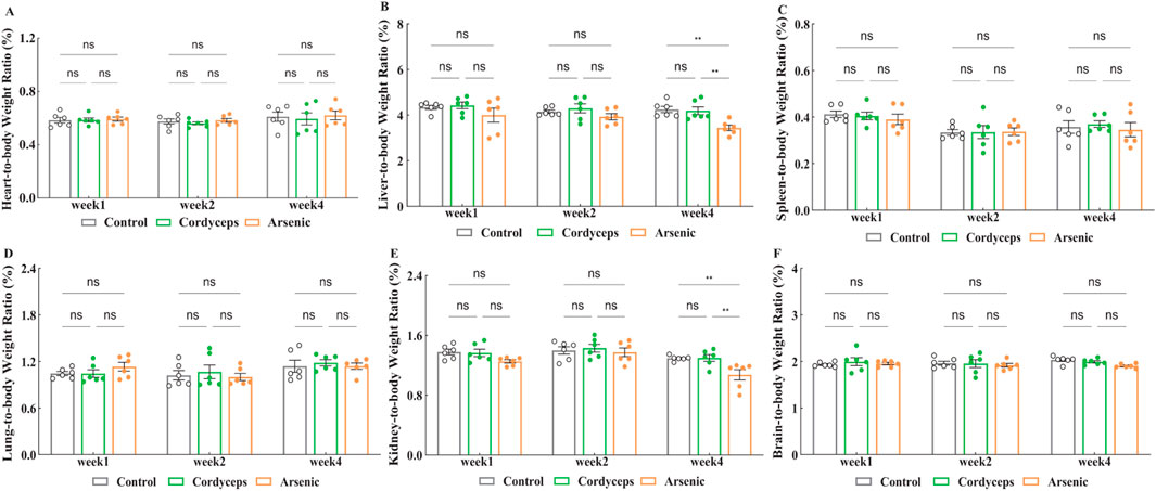 Next, we assessed the organ-to-brain weight ratios, which are less influenced by weight fluctuations and are considered a more objective reflection of organ changes (Bailey et al., 2004; Verhaegen and Van Gaal, 2019). The results revealed no significant changes in the organ‒to‒brain weight ratios of the heart, liver, spleen, lungs, and kidneys in the Cordyceps group (Figure 4A–E). Compared with those in the control group, the organ‒brain weight ratios of the liver and kidneys significantly decreased in the arsenic group at the fourth week (Arsenic vs. Control: 136.62 ± 2.65 vs. 196.79 ± 5.81, (liver organ‒brain weight ratio), n = 6, p < 0.01; Arsenic vs. Control: 47.25 ± 1.30 vs. 65.57 ± 3.42, (kidney organ‒brain weight ratio), n = 6, p < 0.01; Figures 4B,E), which is consistent with the trends observed in the organ‒to‒body weight ratios (Fig. S-3). These findings indicate that wild Cordyceps sinensis has no significant influence on the organ-to-brain weight ratio; however, inorganic arsenic exposure leads to atrophy of the liver and kidneys. The organ-to-body and organ-to-brain weight ratios were consistent, indicating that wild C. sinensis treatment did not significantly impact these ratios in mice. In contrast, inorganic arsenic exposure significantly reduced the liver and kidney ratios, indicating that inorganic arsenic-induced atrophy may impair organ function.