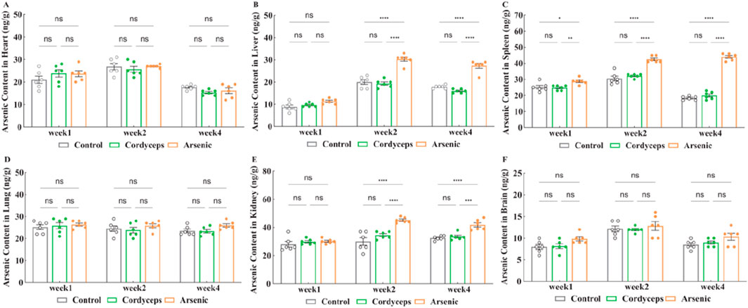 Our preliminary studies indicated that inorganic arsenic induced atrophy in the liver and kidneys of mice. Moreover, the accumulation of inorganic arsenic in the body is the basis of its toxic impacts. Prolonged inorganic arsenic exposure could lead to its accumulation in organs such as the liver and kidneys, resulting in damage to these organs (Abdul et al., 2015). To investigate the differences in organ accumulation between wild Cordyceps sinensis and an equivalent dose of inorganic arsenic in mice, we systematically measured the arsenic content in various organs. In the Cordyceps group, no significant differences were detected in the arsenic levels in the heart, liver, spleen, lungs, kidneys, and brain (Figures 5A–F). In the arsenic group, the spleen arsenic levels continuously increased during the treatment period and were significantly higher than those in the other two groups (p < 0.01, Figure 5C). The Arsenic levels in the liver and kidneys peaked in the second week and decreased by the fourth week, but the arsenic content in these organs remained significantly higher than that in the other two groups (p < 0.01, Figures 5B,E, Supplementary Figure S4), and no significant changes were observed in the arsenic levels in the other organs (Figures 5A,C,D,F). Moreover, compared with the Cordyceps group, the arsenic group presented significantly higher arsenic contents in the liver, kidneys, and spleen (p < 0.01, Figures 5B,C,E). In summary, no arsenic accumulation was detected in the organs of the mice treated with wild C. sinensis; conversely, the arsenic accumulation in the livers, kidneys, and spleens of the mice in the arsenic group was noticeable.