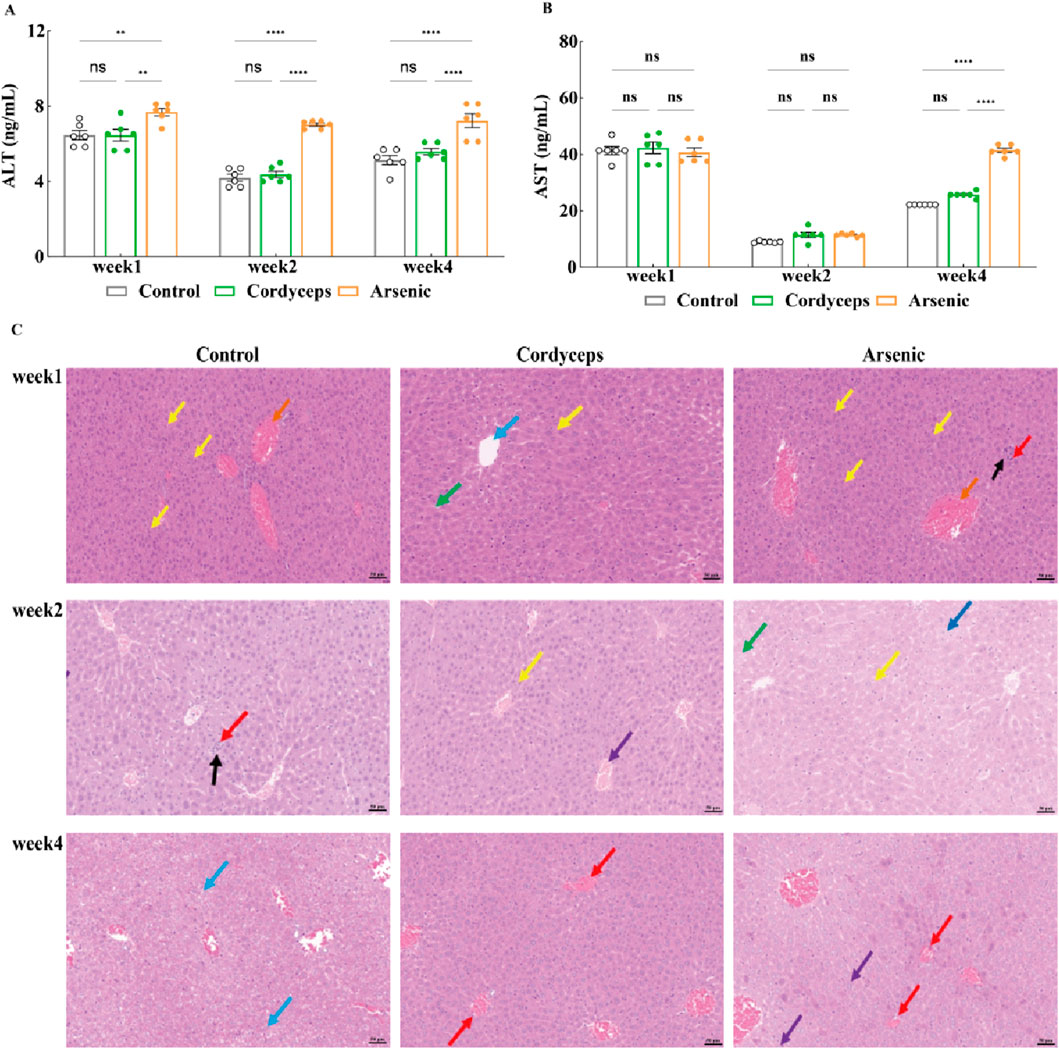 3.4 Wild Cordyceps sinensis had a far lower impact on serum AST and ALT and liver histopathology compared to an equivalent dose of inorganic arsenic