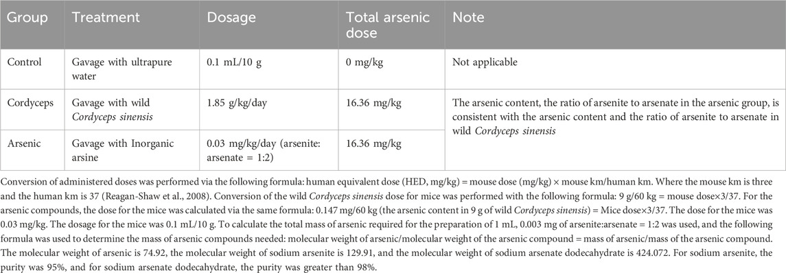 The mice were randomly divided into three groups (n = 18 per group) on the basis of their body weight: the control group, the wild C. sinensis group (Cordyceps), and the inorganic arsenic group (arsenic). The control group was administered ultrapure water by gavage (0.1 mL/10 g). Wild C. sinensis group: Gavage with a wild C. sinensis suspension at a dose of 1.85 g/kg/day (the maximum dose recorded in the pharmacopoeia); arsenic group: Aqueous solution of arsenite and arsenate compounds, with a total arsenic dose of 0.03 mg/kg/day (equivalent to the total arsenic content found in the wild C. sinensis used in this study). The grouping treatment is shown in Table 1, and the experimental procedure is illustrated in Figure 1.