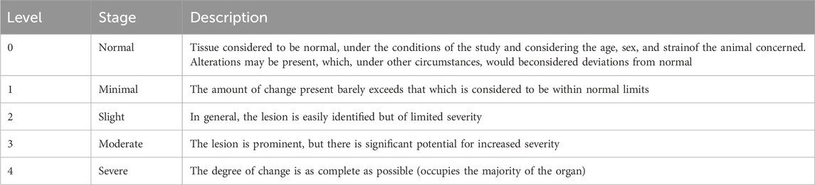 The left lobe of the liver and the left kidney of each mouse were fixed in 4% paraformaldehyde, embedded in paraffin, and sectioned into 5 μm thick slices. The slices were then subjected to routine hematoxylin and eosin (H&E) staining for pathological analysis. The scoring of hepatic and renal pathological damage is based on the standards proposed by Mann (Table 2), which classify the degree of damage into no damage (0 points), very mild damage (1 point), mild damage (2 points), moderate damage (3 points), and severe damage (4 points). Each tissue section was randomly selected from at least three different fields of view, and the scoring was conducted by two professionals via a blinded method (Mann, 2019).