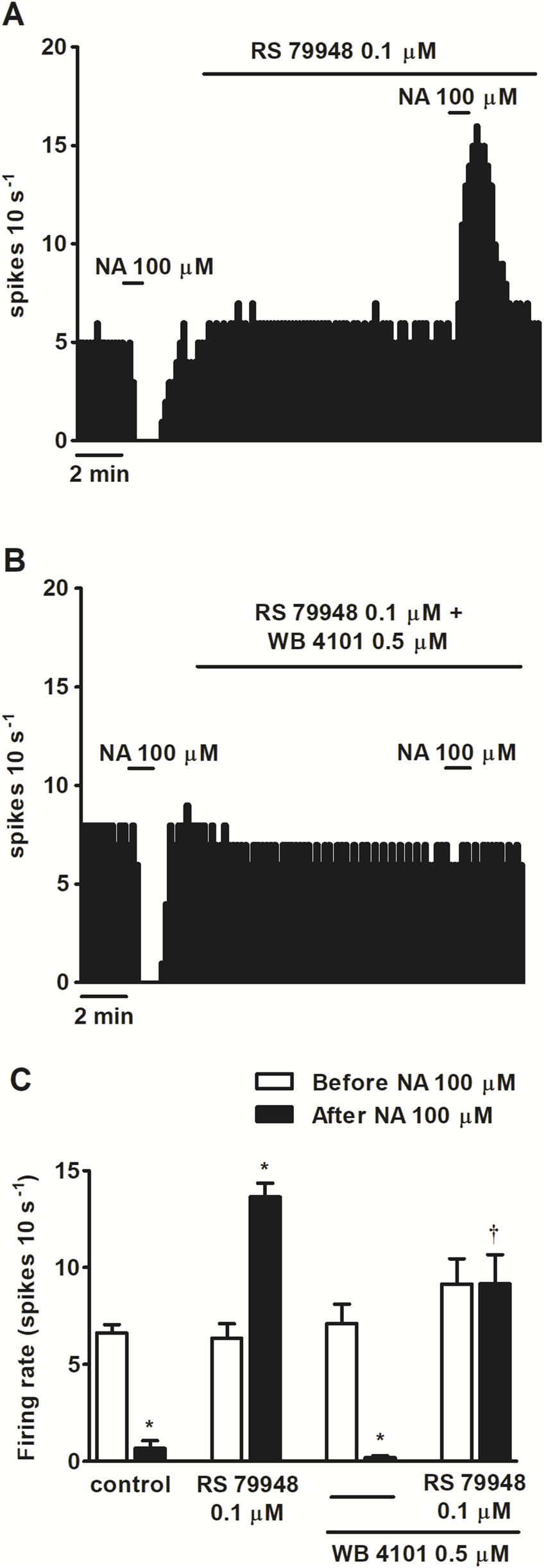 Effect of nonselective adrenergic agonist NA before and after the administration of α2AR antagonist RS 79948 or RS 79948 and α1AR antagonist WB 4101 on the spontaneous FR of LC neurons. (A,B) Representative examples of recordings of single LC neurons showing the inhibitory effect of NA (100 μM, 1 min) or its stimulatory effect in the presence of α2AR antagonist RS 79948 (0.1 μM, 10 min) on the basal FR (A) and the blockade of NA-induced effects in the presence of both RS 79948 (0.1 μM, 10 min) and α1AR antagonist WB 4101 (0.5 μM, 10 min) (B). Vertical lines represent the integrated firing rates (spikes per 10 s). Drugs were bath-applied at the concentrations and for the durations indicated by horizontal bars. (C) Bar histograms showing the mean ± SEM of LC neurons FR before and after the application of NA (100 μM, 1 min, n = 5), NA (100 μM, 1 min) + RS 79948 (0.1 μM, 10 min, n = 5), NA (100 μM, 1 min) + WB 4101 (0.5 μM, 10 min, n = 6), or NA (100 μM, 1 min) + RS 79948 (0.1 μM, 10 min) + WB 4101 (0.5 μM, 10 min, n = 5). *P < 0.05, compared with the FR before the application of NA (100 μM, 1 min) using a paired Student’s t-test. †P < 0.05, compared with the effect (normalized as the percentage change from the baseline FR) induced by NA (100 μM, 1 min) in the absence of WB 4101 (0.5 μM, 10 min) during RS 79948 (0.1 μM, 10 min) perfusion using an unpaired Student’s t-test.
