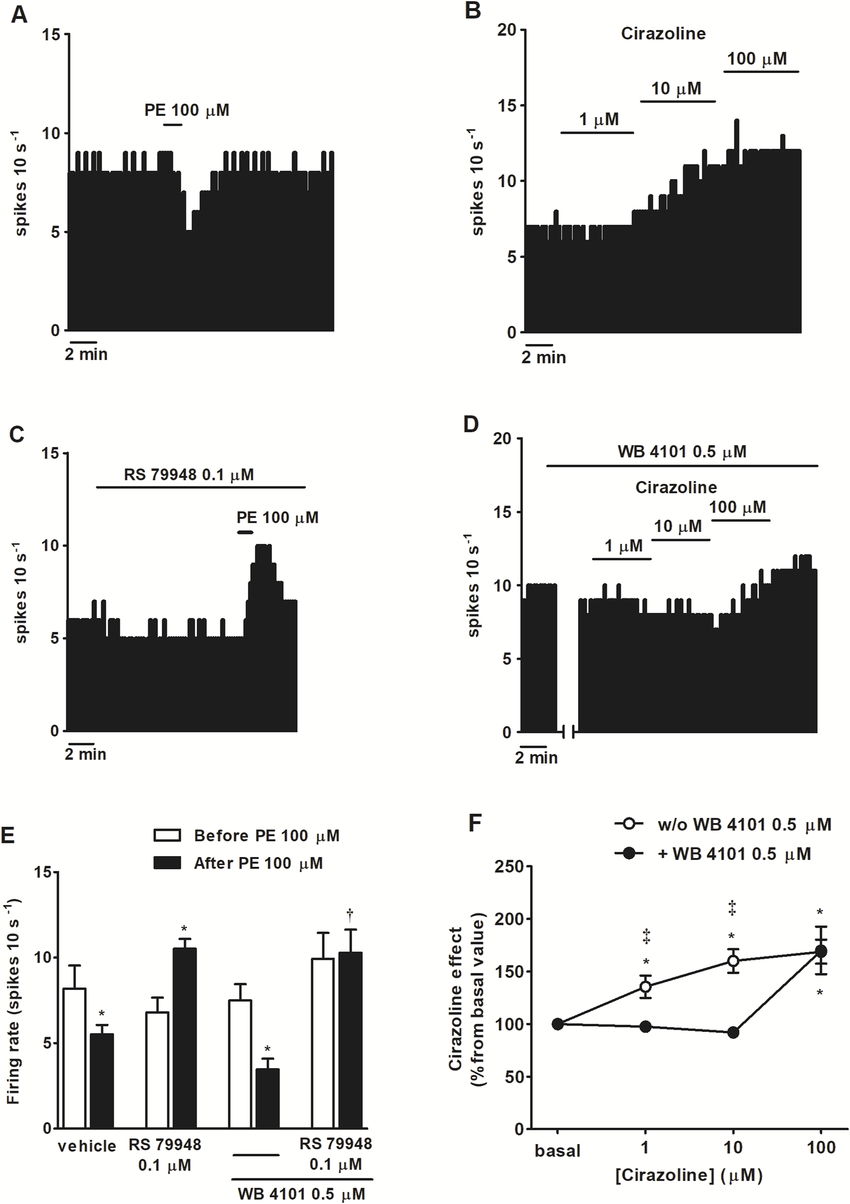 Effect of α1AR agonists PE and cirazoline before and after the administration of α2AR antagonist RS 79948, α1AR antagonist WB 4101 or RS 79948 and WB 4101 on the spontaneous FR of LC neurons. (A–D) Representative examples of recordings of single LC neurons showing the inhibitory effect of PE (100 μM, 1 min) on the basal FR (A), the stimulatory effect of cirazoline (1, 10, and 100 μM; 5–10 min) (B), the stimulatory effect of PE (100 μM, 1 min) in the presence of α2AR antagonist RS 79948 (0.1 μM, 10 min) (C), and the blockade of the stimulatory effect of cirazoline (1, 10 μM, 5–10 min), but not cirazoline (100 μM, 5–10 min), in the presence of α1AR antagonist WB 4101 (0.5 μM, 10 min) (D). Vertical lines represent the integrated firing rates (spikes per 10 s). Drugs were bath-applied at the concentrations and for the durations indicated by horizontal bars. (E) Bar histograms showing the mean ± SEM of LC neurons FR before and after the application of PE (100 μM, 1 min, n = 5), PE (100 μM, 1 min) + RS 79948 (0.1 μM, 10 min, n = 5), PE (100 μM, 1 min) + WB 4101 (0.5 μM, 10 min, n = 7), or PE (100 μM, 1 min) + RS 79948 (0.1 μM, 10 min) + WB 4101 (0.5 μM, 10 min, n = 5). (F) Symbols representing the mean ± SEM of LC neurons FR before and after the application of cirazoline (1, 10, and 100 μM; 5–10 min; n = 12) or cirazoline (1, 10, and 100 μM; 5–10 min) + WB 4101 (0.5 μM, 10 min, n = 5). *P < 0.05, compared with the FR before the application of PE (100 μM, 1 min) using a paired Student’s t-test or with the FR before the application of cirazoline (1, 10, and 100 μM, 5–10 min) using a repeated-measures ANOVA, followed by Bonferroni’s multiple-comparison post hoc test. †P < 0.05, compared with the effect (normalized as the percentage change from the baseline FR) induced by PE (100 μM, 1 min) in the absence of WB 4101 (0.5 μM, 10 min) during RS 79948 (0.1 μM, 10 min) perfusion using an unpaired Student’s t-test. ‡P < 0.05, compared with the effect of cirazoline in the presence of WB 4101 (0.5 μM, 10 min) using an unpaired Student’s t-test.