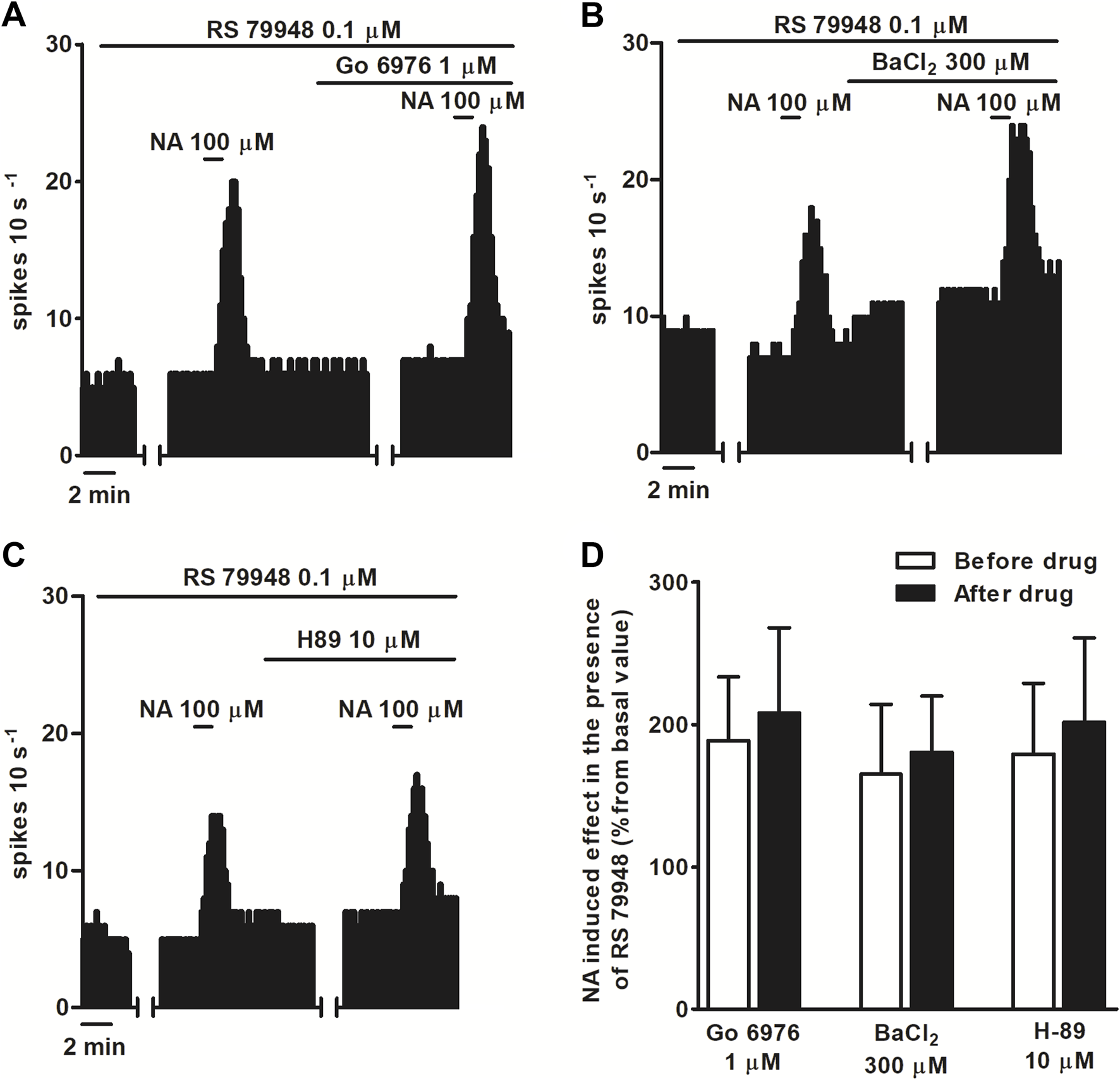 Effect of NA in the presence of RS 79948 before and after the application of PKC inhibitor Go 6976, GIRK blocker BaCl2, or PKA inhibitor H-89. (A–C) Representative examples of recordings of single LC neurons showing the stimulatory effect of NA (100 μM, 1 min) in the presence of RS79948 (0.1 μM, 10 min) before and after the application of Go 6976 (1 μM, 30 min) (A), BaCl2(B), and H89 (C). Vertical lines represent the integrated firing rates (spikes per 10 s). Drugs were bath-applied at the concentrations and for the durations indicated by the horizontal bars. (D) Bar histograms showing the mean ± SEM of the stimulatory effect (normalized as the percentage change from the baseline FR) of NA (100 μM, 1 min) in the presence of RS 79948 (0.1 μM, 10 min), before and after the application of Go 6976 (1 μM, 30 min, n = 5), BaCl2 (300 μM, 15 min, n = 5), or H-89 (10 μM, 20 min, n = 5).