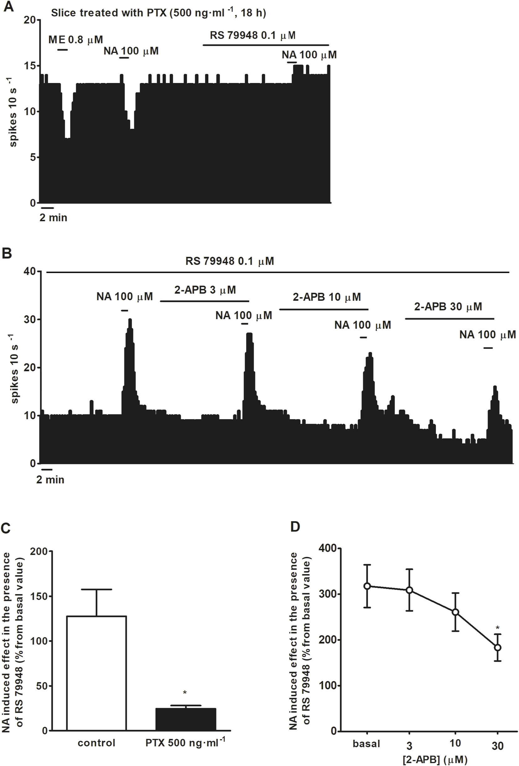 The effects of AR agonists were calculated by subtracting the FR before drug perfusion from the FR after drug perfusion (FRafter−FRbefore). For the inhibitory effect of NA, FRafter was considered the average FR recorded for 60 s after agonist perfusion. For the stimulatory effect, FRafter was the average peak FR recorded for 30 s after perfusion with NA in the presence of RS 79948 or the average FR recorded for the last 120 s after perfusion with cirazoline. FRbefore was the average FR recorded for 60 s before agonist administration. Effects were normalized as the percentage change from the baseline FR before the application of adrenergic agonist. The data and statistical analysis were carried out using the computer program GraphPad Prism (version 5.0 for Windows; GraphPad Software, Inc., San Diego, CA, USA) and comply with the recommendations on experimental design and analysis in pharmacology (Curtis et al., 2015). Values are expressed as the mean ± SEM of n experiments. The FR before or after drug application or the effects of drugs on the FR (% change from the baseline FR) were compared using a paired Student’s t-test within the same cell or an unpaired Student’s t-test between different groups. Comparisons between the effects of different concentrations of a drug in the same cell (cirazoline and 2-APB) were performed using the repeated-measures ANOVA, followed by Bonferroni’s multiple comparison post hoc test. Comparisons between the effect of cirazoline in the absence and presence of different inhibitors were performed using the one-way ANOVA, followed by the Dunnet post hoc test. The threshold of significance was considered as P = 0.05.