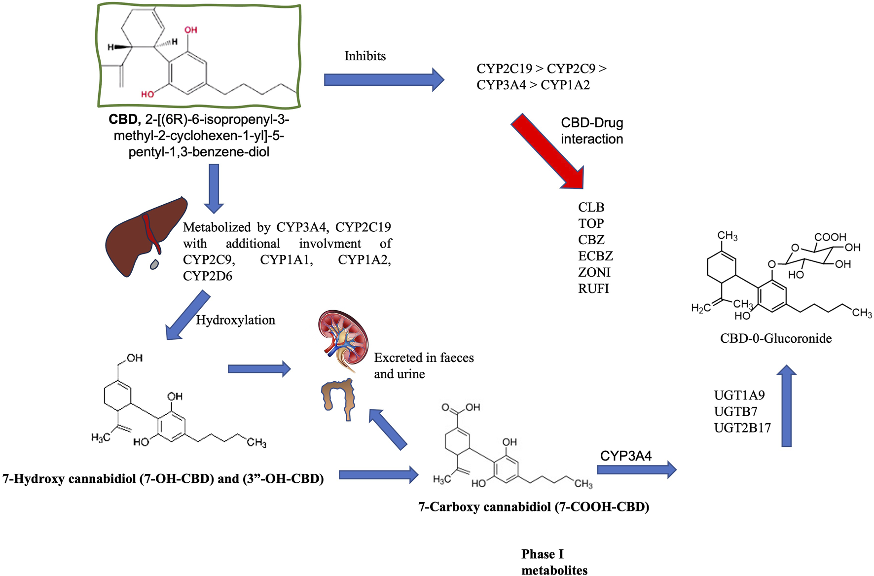 Metabolism of cannabidiol (CBD). CBD is metabolized by cytochrome P450 (CYP450) isoenzymes in the liver, and CYP3A4 and CYP2C19 are recognized as the primary phase I enzymes. CYP1A1, 2C19, 2D6, 3A4, and 3A5 also participate in biotransformation (CYP3A4 and CYP2C19 are the main phase I enzymes). These reactions initially oxidize the CBD molecule to produce 7-OH-CBD. CYP3A4 converts 7-OH-CBD into 7-COOH-CBD, a significant inactive compound in human blood. CYP3A4 is also involved in forming 6α-OH-CBD, 6β-OH-CBD, and 4-OH-CBD. This oxidation is followed by glucuronidation via UDP-glucuronosyltransferase (UGT) through enzymes such as UGT1A9, 2B7, and 2B17. Glucuronidation relies on prior processing by enzymes like CYP2C9 and CYP3A4, as well as the hydroxylated metabolites of CBD. The half-life of CBD in humans varies between studies (considering different doses and routes of administration) and can range from 1 h to 5 days. CBD is eliminated through metabolism and is excreted in an unchanged state, while metabolites are formed in urine and feces [Gonçalves et al., 2019, Harvey and Brown, 1991; Jiang et al., 2011; Ujvary and Hanus et al., 2016; reviewed by Chen et al., 2024]. Carbamazepine (CBZ), Clobazan (CLBZ), Eslicarbazepine (ECBZ), topiramate (TOP), Zonisamide (ZONI).