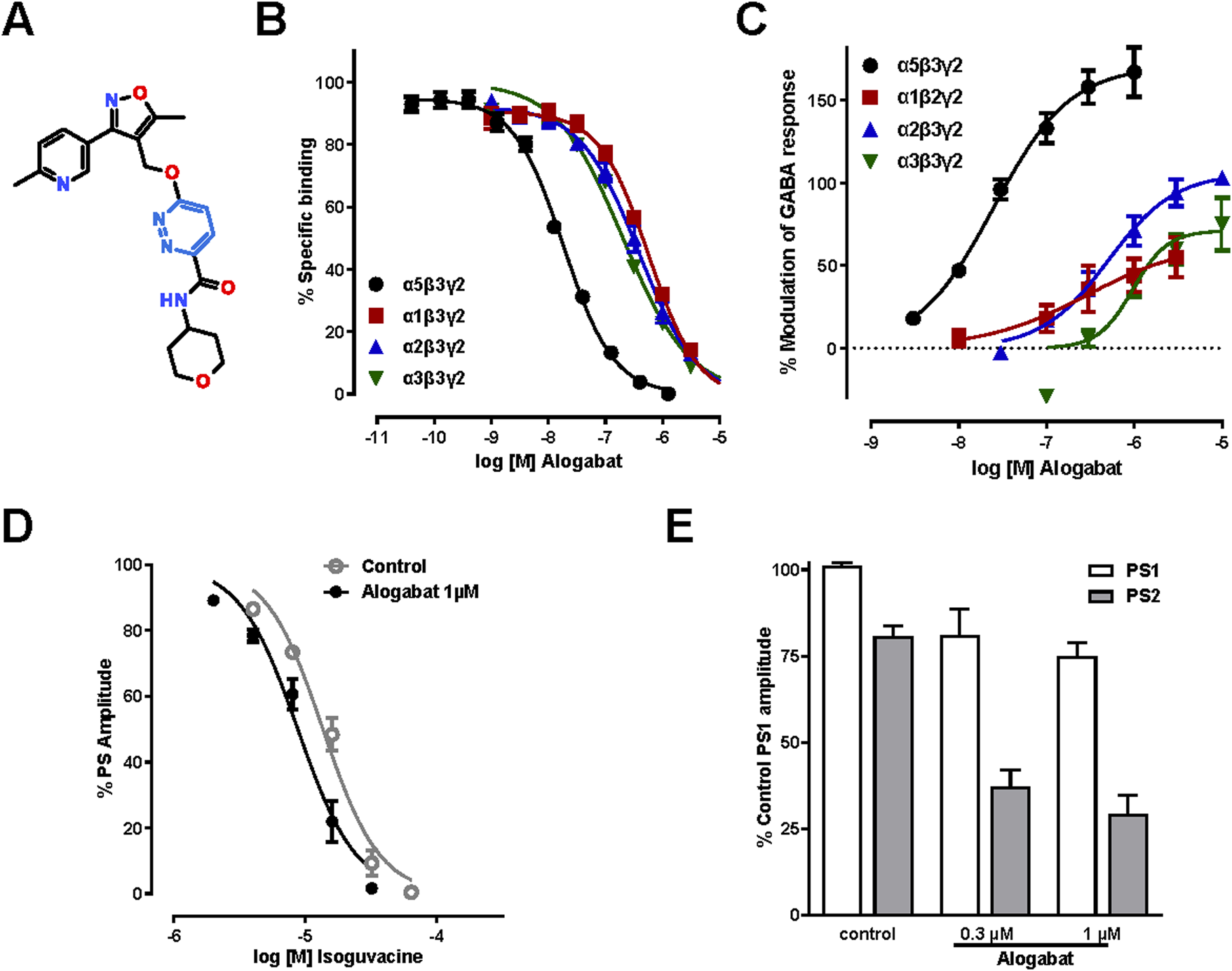 Figure 1. In vitro pharmacology of alogabat. (A) Chemical structure of alogabat (RO7017773; C21H23N5O4); 6-((5-methyl-3-(6-methylpyridin-3-yl)isoxazol-4-yl) methoxy)-N-(tetrahydropyran-4-yl)pyridazine-3-carboxamide (IUPAC name); molecular weight, 409.44 gmol−1. (B) Concentration-response curves of alogabat in [3H]flumazenil competition-binding assays with membranes expressing different rat recombinant GABAA receptor subtypes (n = 10–20/concentration). (C) Concentration-response curves of the effects of alogabat in HEK293 cells expressing different rat recombinant GABAA receptor subtypes (n = 4–5/concentration). Data in the graphs are shown as the mean (symbols) ± SEM (error bars). Error bars smaller than the symbol size are not shown. (D) Isoguvacine concentration-response curves obtained in the presence and absence of alogabat in rat hippocampal slices. The points represent the mean values ± SEM of three slices. The sigmoidal curves were fit through these points. (E) The PPI of PS was measured in the absence (control) and presence of alogabat at 0.3 µM (n = 3 slices) and 1 µM (n = 6 slices). PS1 and PS2 are the responses induced by the first and second stimulus, respectively. The data are normalized to the amplitude of PS1 and presented as the mean ± SEM.