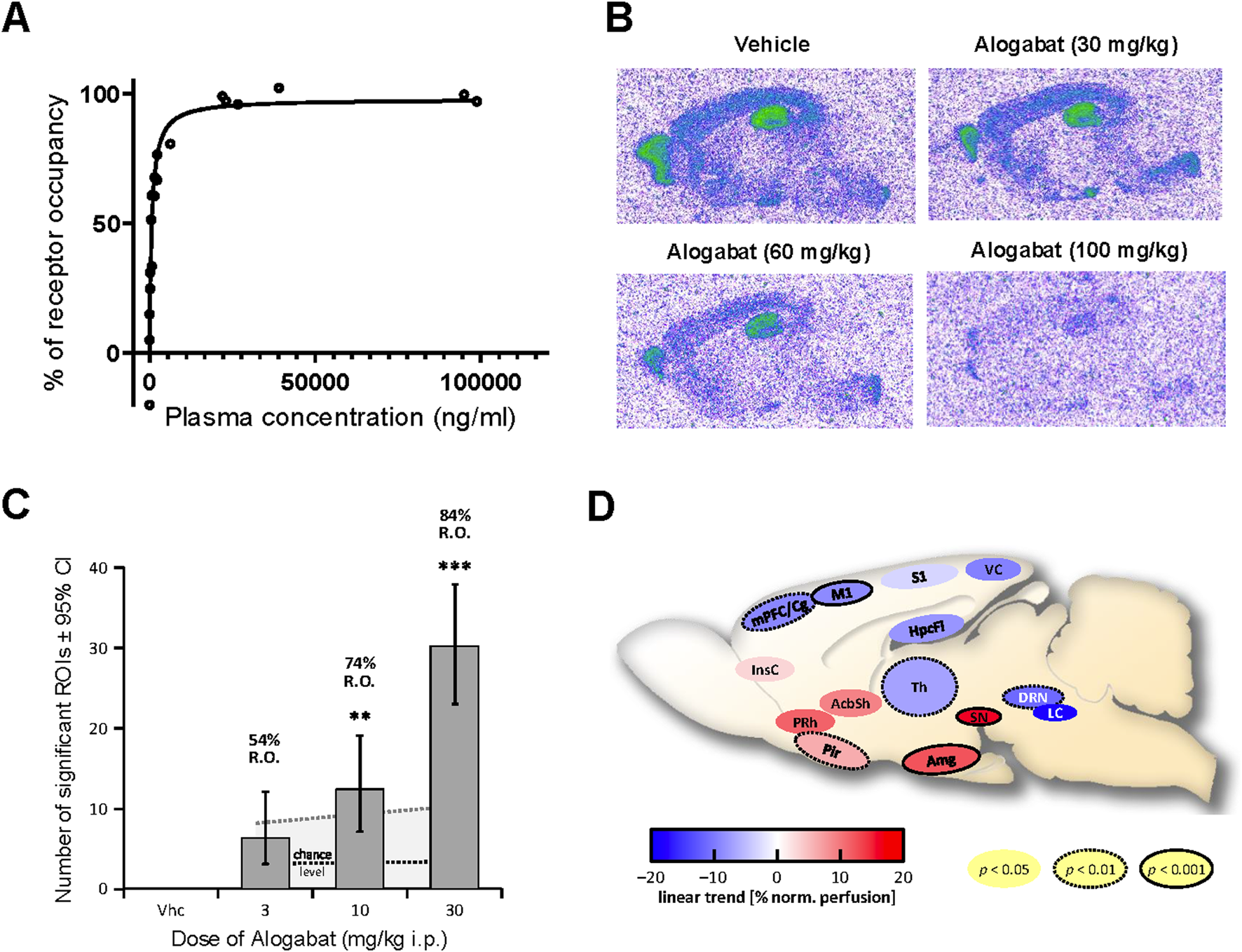 Figure 2. Receptor occupancy and phMRI signature of alogabat following acute administration. (A) Concentration-dependent blockade of [3H]RO0154513 binding by alogabat in Wistar rats: with increasing concentrations from the different doses (0.3–100 mg/kg i.p., n = 3/dose) of alogabat (vehicle = without pre-treatment, n = 3). (B) Representative autoradiograms of alogabat ex vivo occupancy in Cntnap2−/− mice via in vitro incubation of the highly selective GABAA-α5 receptor radioligand [3H]L-655,708 to sagittal brain sections. The Cntnap2−/− mice were treated with vehicle and 30, 60, or 100 mg/kg i.p. alogabat (n = 4/dose). (C) Trend of normalized-perfusion response pattern strength increasing with dose, given as numbers (± 95% confidence intervals) of significantly (de-)activated regions of interest (ROIs) following the administration of alogabat (n = 8/dose) to Fischer (F344) rats under medetomidine sedation. “Chance level” = mean (black dotted line) and 95th percentile (gray dotted line) derived from the permutation test. Significant deviations in the number of modulated ROIs from the chance level are denoted by *p < 0.05, **p < 0.01, and ***p < 0.001 (uncorrected). RO is the calculated receptor occupancy for GABAA-α5 from measured plasma concentrations at each dose. (D) Sagittal schematic of rat brain showing ROIs with a significant dose-dependent modulation (linear trend of normalized perfusion). ROIs passing false discovery rate control at 10% are shown, with ROI outlines indicating uncorrected significance level (no outline, p < 0.05; dotted outline, p < 0.01; and solid outline, p < 0.001). ROI abbreviations: AcbSh, nucleus accumbens shell; Amg, amygdala; DRN, dorsal raphe nucleus; HpcFi, fimbria hippocampi; InsC, insular cortex; LC, locus coeruleus; M1, primary motor cortex; mPFC/Cg, medial prefrontal, cingulate cortex; Pir, piriform (entorhinal) cortex; PRh, perirhinal cortex; S1, primary somatosensory cortex; SN, substantia nigra; Th, thalamus; VC, visual cortex.