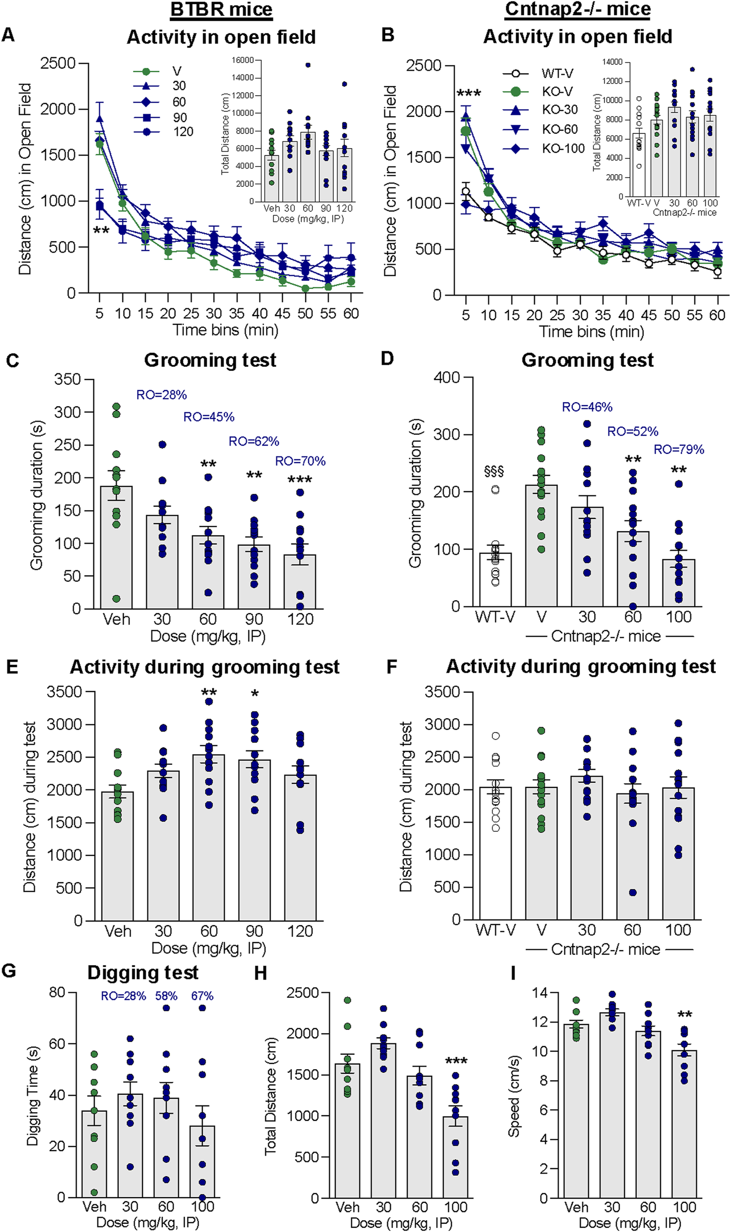 Figure 4. Effect of alogabat on repetitive behaviors in BTBR and Cntnap2−/− mice. (A) Alogabat was administered i.p. 30 min prior to the assessment of locomotor activity in an open-field test in BTBR mice: distance traveled (cm) per 5 min time bin (line graph) and in 1 h total (bar chart inset). (B) Alogabat was administered i.p. once daily for 2–3 days, and on the test day, it was administered 30 min prior to testing Cntnap2−/− mice in an open field: distance traveled (cm) per 5 min time bin (line graph) and in 1 h total (bar chart insert). In BTBR mice, on a separate test day, alogabat was administered i.p. 30 min prior to the grooming test: (C) duration (s) of grooming behavior and (E) distance (cm) traveled during the 10 min period in the test chamber. In Cntnap2−/− mice, alogabat was administered i.p. once daily for 8–10 days, and on the test day, it was administered 30 min prior to the grooming test: (D) duration (s) of grooming behavior and (F) distance traveled during the 10 min period in the test chamber. Data are presented as individual points (circles) and mean ± SEM (BTBR: n = 12/group; Cntnap2−/−: n = 14–15/group). Statistics: *p < 0.05, **p < 0.01, and ***p < 0.001 vs. vehicle (Veh)-treated BTBR or Cntnap2−/− mice. §§§p < 0.001 vehicle-treated wildtype (WT-V) mice vs. vehicle (V)-treated Cntnap2−/− mice. Alogabat was administered i.p. 30 min prior to the assessment of digging behavior in BTBR mice: (G) duration (s) of digging behavior, (H) distance traveled (cm), and (I) speed (cm/s) during the 5 min period in the test chamber. Data are presented as individual points (circles) and mean ± SEM (n = 12/group). Statistics: **p < 0.01 and ***p < 0.001 vs. vehicle-treated BTBR mice. RO is the calculated receptor occupancy for GABAA-α5 from the measured plasma concentrations at each dose.