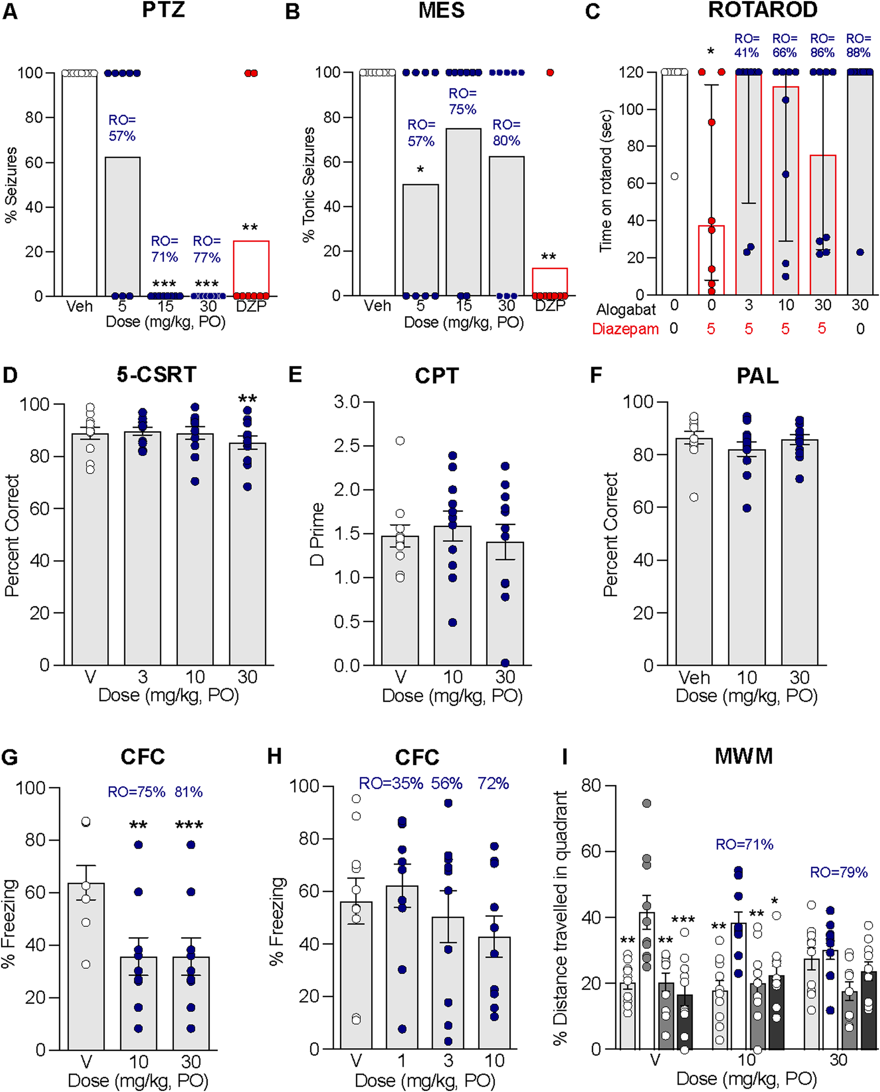All statistical analyses were performed using Prism (GraphPad software). One-factor ANOVA was used for between-group comparison (i.e., dose), with repeated measures for within-subject comparison (i.e., time bins and platform quadrants). Dunnett’s test was used for post hoc comparisons. Student’s unpaired two-tailed t-test was used when two groups were compared. The chi-square test was used to compare the percentage of groups. Rotarod data were analyzed using a non-parametric Kruskal–Wallis test, followed by Dunn’s multiple comparison test. Statistical significance was predetermined as p < 0.05.