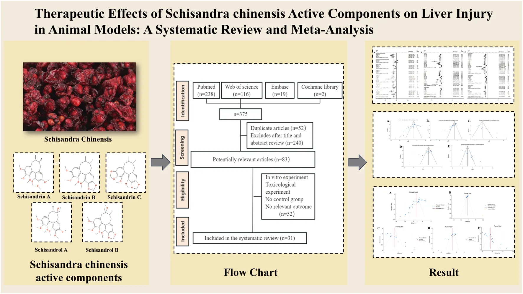 While numerous studies have investigated the hepatoprotective effects of Schisandra chinensis, its precise molecular mechanisms and clinical translational potential remain unclear. A systematic review and meta-analysis are crucial for consolidating existing evidence and enhancing the reliability of these findings (Siddaway et al., 2019). Current evidence suggests no systematic evaluation exists regarding the therapeutic efficacy of Schisandra chinensis for hepatic injury. Therefore, this work attempts to systematically assess the protective effects and underlying mechanisms of Schisandra chinensis in models of liver injury.
