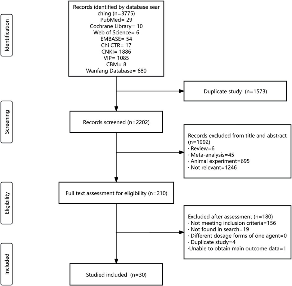 The systematic literature search encompassed nine databases, yielding a total of 3,775 citations. The databases included PubMed, Cochrane Library, Web of Science, EMBASE, CNKI, VIP, CBM, Chi CTR, and the Wanfang Database. After eliminating duplicate records, 2,202 titles and abstracts were initially screened, leading to the selection of 210 articles for a thorough eligibility assessment. Finally, 30 RCTs were included. ALL RCTs were uniformly conducted within China, spanning the period from 2006 to 2022 (Figure 1).