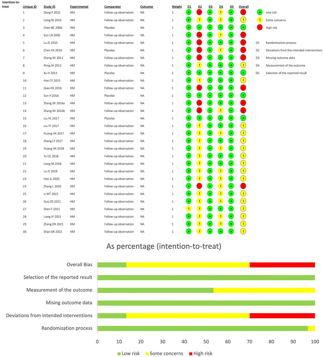 Chart displaying a risk of bias assessment for various studies. Top section lists studies with columns for study ID, experimental type, comparator, and risk indicators (D1-D5) colored green, yellow, or red for low risk, some concerns, and high risk respectively. Bottom section shows a bar graph illustrating the aggregate bias percentages across different criteria, using the same color code.