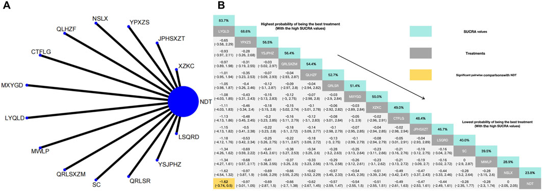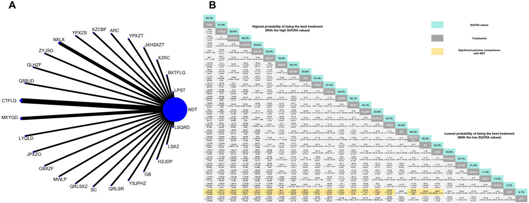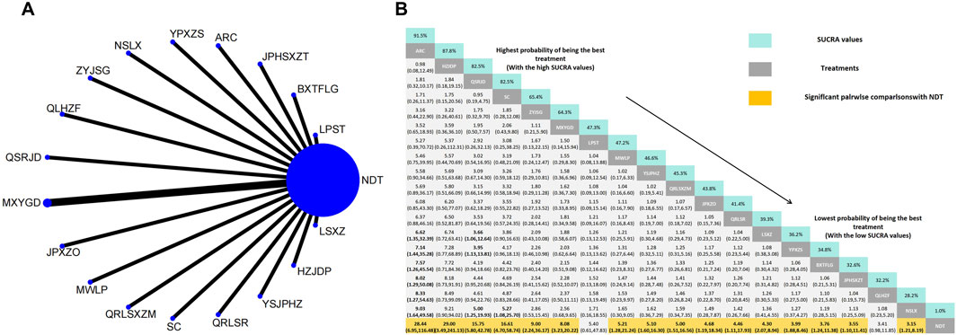 Figure 8. (A) Network meta-analysis of available comparisons. (B) Legend relative effects size of efficacy at TCMSS according to NMA. Treatments are ranked according to their chance of being the best treatment. Numbers in the grey boxes are the values of SUCRA, which represents the rank of treatment in TCMSS. Significant pairwise comparisons with NDT are highlighted in orange. Results with significant differences are bolded.