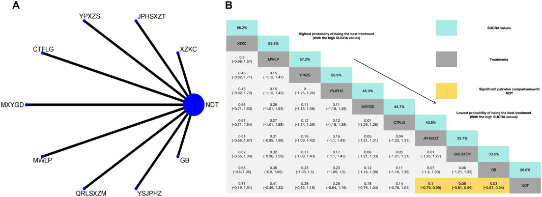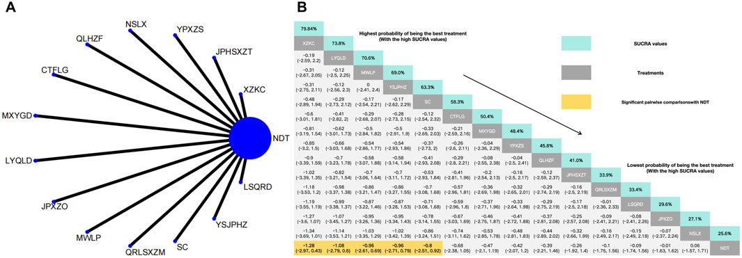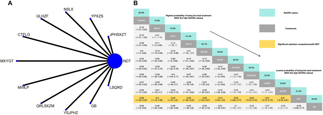 Diagram labeled A and B. A: A network graph showing NDT as a central node connected to multiple treatments, each labeled with codes like NSLX and MXYGT.B: A table ranking treatments by SUCRA values, from highest (YSJPHZ, 80.9%) to lowest (GB, 30.8%). SUCRA values are highlighted in cyan, treatments in gray, and significant pairwise comparisons with NDT in yellow.
