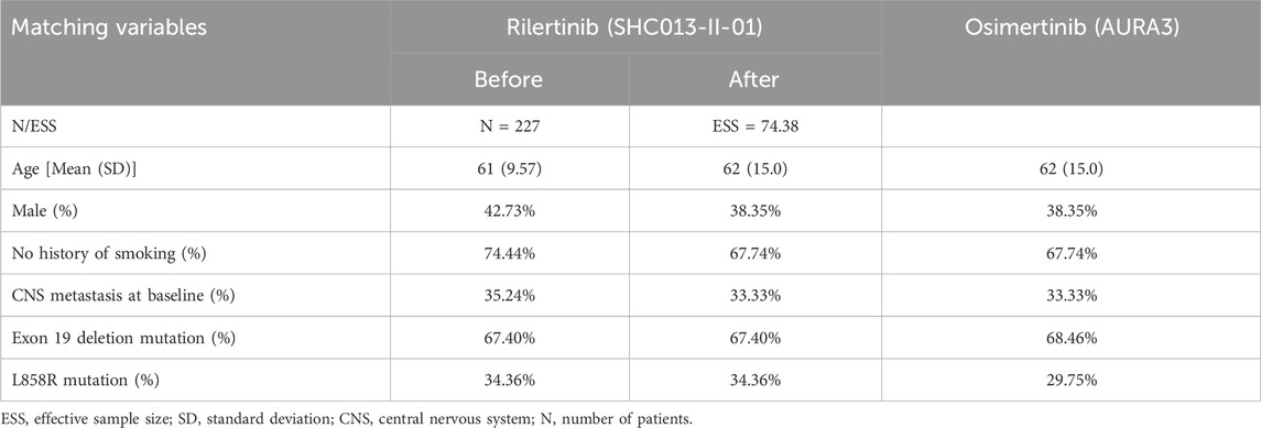 Due to the absence of head-to-head studies comparing rilertinib with osimertinib, indirect comparisons were required in this study. Given the availability of IPD of rilertinib but only aggregate data (AgD) of osimertinib, the unanchored matching-adjusted indirect comparison (MAIC) method (Phillippo et al., 2016) was used, as there was no common comparator in SHC013-II-01 and AURA3. For the selection of matching variables, we referred to the published literature employing MAIC, Cox analysis results, clinical opinions, and the availability of baseline characteristics. Ultimately, six variables were selected for MAIC: age, sex, smoking status, central nervous system (CNS) metastasis at baseline, Exon 19 deletion mutation, and L858R mutation. The Cox analysis results and the rationale for selecting these matching variables were presented in Supplementary Tables S1, S2, respectively. The selection of matching variables was based on the intersection of key prognostic factors reported in both the SHC013-II-01 trial IPD and the published AURA3 trial AgD (Mok et al., 2017; Papadimitrakopoulou et al., 2020). Consequently, variables such as race could not be included, as this information was unavailable in the rilertinib IPD. Similarly, ECOG performance status was not included as it was not reported in the AURA3 publication. However, the inclusion criteria for both trials restricted enrollment to patients with “locally advanced or metastatic NSCLC”, indicating substantial comparability in disease stage between the two cohorts. The final baseline characteristics before and after matching are shown in Table 1. The effective sample size (ESS) was 74.38; this metric is calculated to assess the validity of the matching process, with a larger value indicating a better balance. The detailed principles and calculation formula are described in Supplementary Methods 1.