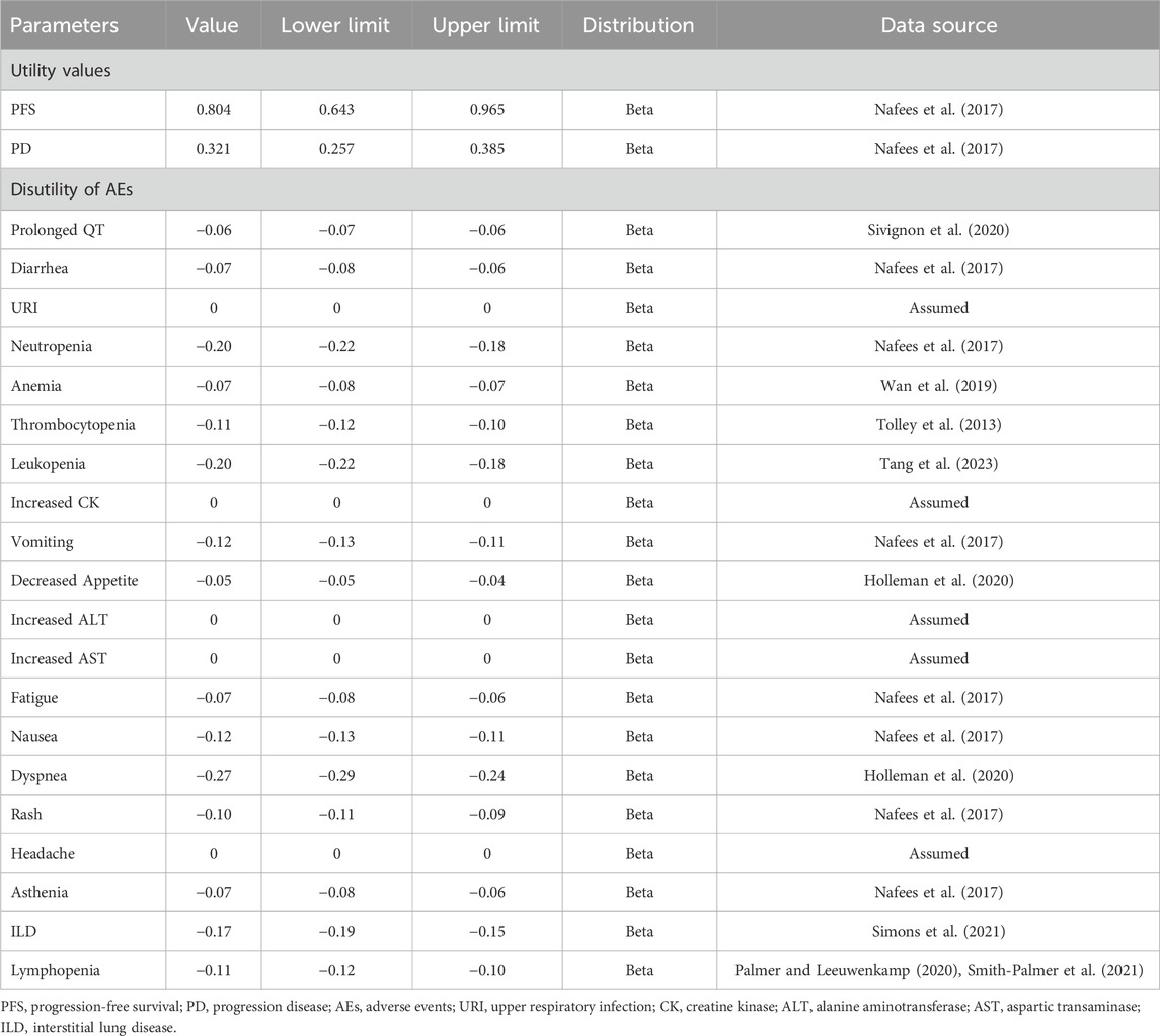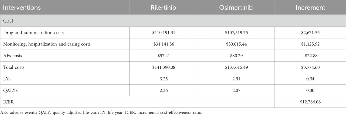 QALYs were determined through health state utility values (HSUVs). These HSU values were individually computed for patients in the PFS and PD states. An assumption was made that utility values remained consistent across different treatment groups. HSU values of PFS and PD were sourced from a study of health state utilities in NSCLC conducted by Nafees et al. (2017), since the original trials of both interventions did not measure patients’ quality of life. We extracted the China-specific utility values, and the values of PFS 1, PFS two and PFS three states were 0.804 while the value of end-stage state was 0.321 in the base–case analysis. Furthermore, disutilities associated with treatment-related adverse events (AEs) with a severity of grade ≥ 3 and an incidence of ≥1% were integrated into the model. Because these AEs were expected to meaningfully reduce the quality of life, grade 1/2 AEs were generally self-limited (Lu et al., 2023). The AEs incidence of rilertinib was provided by Sanhome. Given osimertinib’s extensive clinical use and well-documented safety profile, which are comprehensively reported in its package insert, AEs and their incidence for the osimertinib arm were derived from the drug’s package insert in the base-case analysis.