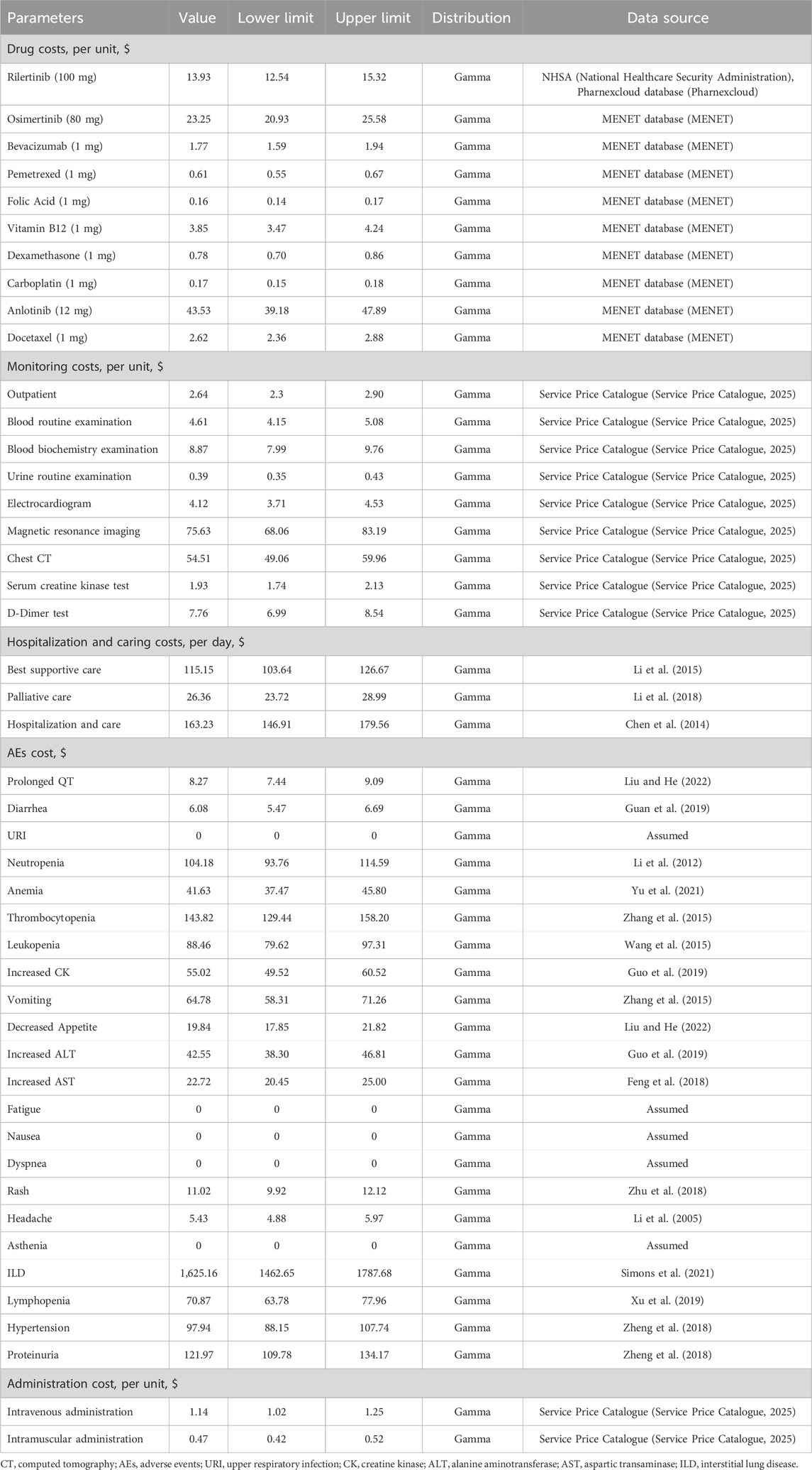 In PFS one state, it was assumed that subjects would not incur additional drug administration costs, as both rilertinib and osimertinib are oral drugs. The latest price of rilertinib was 13.93 USD/100 mg (National Healthcare Security Administration, 2025; Pharnexcloud database, 2025), while the price of osimertinib was 23.25 USD/80 mg (MENET, 2025). In the PFS two state, the drug costs encompassed not only the expenses of bevacizumab injection, pemetrexed disodium injection, and carboplatin, but also covered prophylactic drugs (folic acid, vitamin B12, dexamethasone), along with the costs associated with administering non-oral drugs. In PFS three state, the drug costs involved anlotinib, docetaxel injection, prophylactic dexamethasone, and the charges for non-oral drug administration. Detailed information on drug costs in this study is shown in Table 3.