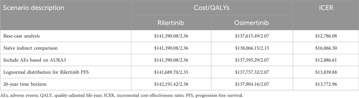 Nonetheless, this study has several limitations. First, although MAIC was used to adjust for observed baseline differences between rilertinib and osimertinib trial populations, residual confounding from unobserved prognostic factors may remain. For instance, variables such as ECOG performance status and race could not be matched, as they were not reported in the AURA3 or were unavailable in the IPD of rilertinib. Future head-to-head randomized controlled trials are needed to validate these results. Second, utility data were derived from literature, using methods consistent with prior studies (Wu et al., 2018; Guan et al., 2019; Wu et al., 2019), which may introduce uncertainty. However, sensitivity analysis demonstrated that the ICER remained stable and below the threshold. Third, the model adopted protocol-specified dosing rather than real-world practices patterns, potentially affecting resource use estimates. Despite this, a series of sensitivity analysis confirmed the robustness of the model across a broad range of parameter values. Fourth, subgroup analyses based on potential differences in acquired resistance mechanisms or patient histology were not performed due to limited evidence. Nevertheless, the unified post-progression pathway in our model reflects the standard of care for the overall T790M-positive population, an approach supported by major clinical guidelines as well as expert consultation. These assumptions are considered reasonable and are unlikely to affect the study’s main conclusions.