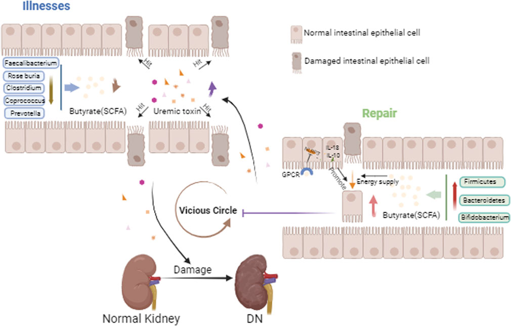 Figure 1. Gut-kidney axis in DN. This figure mainly depicts the reduced distribution of butyric acid-producing bacteria in the gut in the DN state, the reduction of butyric acid, the damage to the intestinal epithelium, the entry of accumulated uremic toxins into the circulation aggravating renal injury, and with the aggravation of renal injury, the uremic toxins are deposited in the gut, becoming a vicious cycle. And with the increase of butyric acid producing bacteria, this vicious cycle is inhibited.