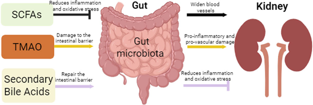 Figure 2. Intestinal and renal effects by gut microbiota metabolites. This figure depicts the effects of three major microbial metabolites, SCFAs, TMAO, and secondary bile acids, on the gut and kidneys, where SCFAs and Secondary Bile Acids protect the gut and kidneys by attenuating oxidative stress and inflammation, while TMAO promotes the inflammatory process leading to renal fibrosis, while the TMAO accumulation leads to damage of the intestinal epithelial barrier.
