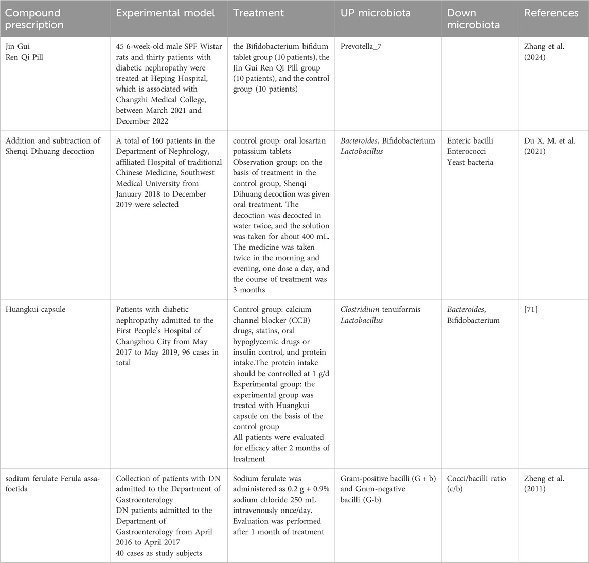 TCM prescription is one of the important forms of TCM treatment, which is also essential in DN therapy (Table 1; Table 2). Xiancao Granule (CXCG) is a traditional Zhuang medicine prescription derived from Zhuang folk herbs in Guangxi, China. The Zhuang are an ethnic minority in China with a rich ethnic medicine culture and traditions. Mo et al. (2024) showed that CXCG could increase the relative abundance of beneficial bacteria (e.g., Alloprevotella, Oscillibacter, Anaeroplasma, and Anaerotruncus) and decrease the relative abundance of harmful bacteria (e.g., Faecalibacterium), improving the structure of intestinal microbiota in DN rats. By increasing the abundance of gut microbiota with anti-inflammatory properties, CXCG may help reduce inflammatory markers associated with DN, such as serum levels of IL-6, TNF-α, and MCP-1. In addition, it can also improve the metabolic disorders of DN rats by regulating metabolic pathways related to carbohydrate and amino acid metabolism, such as TCA cycle, vitamin C and aldehyde metabolism, and C-type lectin receptor signaling pathway. The microbiota and metabolism were regulated to improve the renal function parameters of DN rats, including decreased levels of urine microalbumin (MUA) and serum creatinine (Scr), as well as less degenerative kidney tissue damage. Qing-Re-Xiao-Zheng formula (QRXZF) is a TCM prescription (Wang et al., 2023; Gao et al., 2021) that reduced the release of inflammatory factors by inhibiting the activation of inflammatory signaling pathways such as TLR4/NF-κB/NLRP3. Meanwhile, QRXZF reduced renal inflammatory response by enhancing intestinal barrier function, reducing intestinal permeability, translocation of endotoxins (such as lipopolysaccharide LPS), and the production of inflammatory factors. Among them, polysaccharides and other ingredients not only have antioxidant effects, but also scavenge free radicals, reduce oxidative stress, and protect kidney cells. Moreover, QRXZF enhanced the balance of intestinal microecology and accomplished the goal of treating diseases by encouraging the growth of helpful bacteria and preventing the reproduction of bad bacteria through the metabolism of intestinal microorganisms. According to Hong et al. (2023) it lessened the buildup of urinary toxins such as trimethylamine-N-oxide, p-cresyl sulfate, and indoxyl sulfate. It also lessened inflammation by lowering levels of inflammatory cytokines like NLRP3, IL-6, and IL-17A. In addition, its active ingredient, calycosin-7-O-β-D-glucoside, interacted with the gut microbiota and stimulated the growth of probiotics, thus exerting its therapeutic effect. Besides, it was reported that Jingui Kidney Qi Pills, Ginseng Qi Dihuang Decoction, Shrinking Spring Yi Kidney Fang, Yuye Tang, Bekhogainsam Decoction, and Jowiseungki decoction (JSD) have similar regulatory mechanisms (Zhang et al., 2024; Meng et al., 2020a; Meng et al., 2020b; Guo et al., 2024; Du X. M. et al., 2021; Yao et al., 2020). And Yuye Tang also improved intestinal barrier function, lower intestinal permeability, and raised the expression levels of the colonic mucosal barrier proteins Occludin and ZO-1, which stopped bacteria and toxins from translocating. Reducing the risk of systemic inflammation and organ damage by regulating the levels of cAMP and cGMP, Yuye Tang affected the body’s energy balance and metabolic processes, which might help to improve energy metabolism and overall health in patients with DN. Xiaoli Wang, et al. noted that nephritis rehabilitation granules (Wang et al., 2018) concentrated more on the regulation of gut microbiota metabolites, which is manifested in reducing inflammation by enhancing the role of certain SCFAs in the intestine or increasing their production. These included propionic acid and butyric acid, which inhibited the production of inflammatory cytokines like TNF-, IL-2, and IL-6, thereby playing a role in anti-inflammatory. In the bargain, SCFAs could promote the secretion of glucagon-like peptide-1 (GLP-1) and peptide YY (PYY), hormones that helped lower blood glucose levels and improved glycolipid metabolism. Strengthening the intestinal barrier, restricting the entry of hazardous substances, controlling intestinal motility, and providing the primary energy source for colon cells are all made possible by SCFAs. At the same time, clinical trials have also achieved good results. Clinical observations indicated the anti-inflammatory and intestinal barrier-protecting properties of SCFAs, Huangkui capsule had a role in improving the gut flora’s subpopulations and dispersion by regulating the amount of gram-positive and gram-negative bacteria in the colon, Qiditang nephroid formula (QDTS) had a great effect on bile acid metabolism, and affects bile acid metabolism by changing the gut microbiota (Wei et al., 2021). Bile acids in QDTS constituted important byproduct of the metabolism of gut microbes and were essential for controlling the host’s inflammatory and metabolic reactions. Certain bile acids, such taurocholic acid (TCA), tauro-Mulisiccic acid (T-MCA), deoxycholic acid (DCA), and murichticolic acid (-MCA), was reduced in serum levels by QDTS. Bile acids were associated with the activation of FXR, which was highly expressed in the kidney. While, db/db animals treated with QDTS did not show a substantial change in FXR expression in their kidneys, QDTS may have an indirect effect on FXR activity by altering the amount of bile acids, which would protect the kidneys. San-Huang-Yi-Shen (SHYS) is a TCM formula. The study discovered that SHYS influenced the β diversity of gut microbiota in DN model rats, as well as the relative abundance and metabolite levels of particular bacterial genera. It also affected a range of metabolic pathways, including glycerophospholipid metabolic processes, tryptophan metabolic rate, alanine, aspartic acid and glutamic acid. digestion, the arginine metabolism, tricarboxylic acid (TCA) cycle, tyrosine metaboli