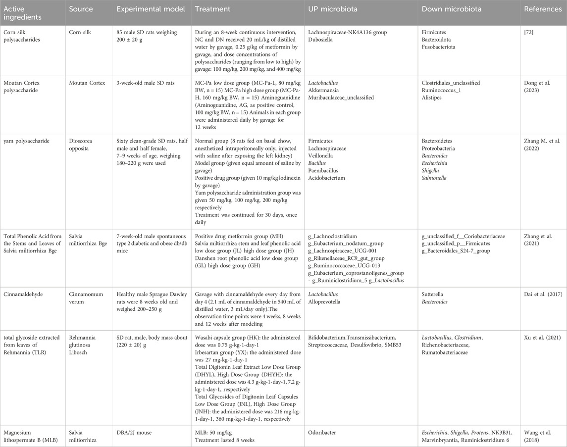 The active ingredients are the target site for the effectiveness of TCM. Various TCM ingredients were identified by morden technology and were used for conducting experiments on the treatment of DN (Table 3; Table 2). The composition of corn silk polysaccharides (CSPS) has the potential to enhance the gut microbiota’s structure (Dong et al., 2023). Patients suffering from DN frequently have an imbalance in their gut microbiota. CSPs can regulate the dominant strains in the gut, such as Firmicutes, Bacteroidetes, Lachnospiraceae-NK4A136 and Dubosiella. Meanwhile, CSPs can affect the metabolism of key endogenous metabolites that interact with the gut microbiota, including glycerophosphate, fatty acids, bile acids, tyrosine, tryptophan, and phenylalanine. Variations in these metabolites are directly linked to the onset of DN and are linked to changes in the gut flora. Among these, the intestinal microbiota has a major impact on bile acid metabolism. CSPs can control bile acid metabolism and minimize bile acid buildup in the body, which lowers the inflammatory response and kidney cell damage. Peony peel polysaccharide (MC-Pa) improves the pathological condition of DN by influencing the gut microbiota and its byproducts through several means. It can improve the structure of the intestinal microbiota and enhance the intestinal barrier function, among which it is worth noting that MC-Pa can promote the production of SCFAs and reduce the production of branched-chain fatty acids (BCFAs), thereby exerting a positive therapeutic effect on DN (Zhang M. et al., 2022). In addition to the regulation of the structure of the gut microbiota and its metabolites, cinnamaldehyde, rehmannia leaf glycosides, Yam polysaccharides and total phenolic acids were all effective in improving renal function and regulating the gut microbiota (Zhang et al., 2021; Xu et al., 2021; Dai et al., 2017; Wang et al., 2018). Magnesium lithospermate B (MLB), a drug used to treat angina, has been found to improve kidney damage in a mouse model of DN via alterations to the bile acid biosynthesis and gut microbiota, in addition to which MLB may indirectly improve kidney function by affecting microbiota associated with blood pressure regulation (Zhao et al., 2019). But, the results on experimental animals can not completely represent the clinical effects. Surprisingly, a clinical study shown that sodium ferulate have great potential in the management of DN patients by alterations to the gut microbiome (Zheng et al., 2011). On the basis of animal experiments, it is believed that more TCM active ingredients will also be able to be applied in clinical practice.