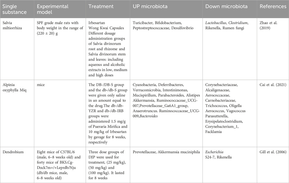 When treating DN, single herb Chinese medicine is also effective in controlling the gut flora and its metabolites (Table 4). For example, Danshen from the roots of Salvia miltiorrhiza plants can alleviate the glucose kidney lesions by increasing the relative microbial abundance. In addition, the stems and leaves of Salvia miltiorrhiza are usually discarded as waste, which were proved to have certain pharmacological activities to regulate gut microbiota, providing a basis for the comprehensive utilization of Salvia miltiorrhizae plants (Xu et al., 2021; Cai et al., 2021). It can be seen that Salvia miltiorrhiza has an important role in the treatment of DN, by regulating the interaction between the gut microbiota and metabolites, such as phosphatidylcholine (PC), phosphatidylethanolamine (PE), lysophosphatidylcholine (LysoPC), sphingomyelin (SM), and other metabolites. Its complex mode of action involves not just interacting with metabolites or gut microbiota individually, but also regulating the balance of the gut microbiota as a whole and the interaction with individual microorganisms (Gill et al., 2006). Dendrobium can not only improve the abundance of gut microbiota, but also increase the relative abundance of beneficial bacteria such as Prevotella/Akkermansia, and reduce the relative abundance of harmful bacteria such as S24-7/Rikenella/Escherichia coli, which may be associated with inflammation and insulin resistance. It also impacts the synthesis of fatty acids, such as SCFAs, which can modify lipid metabolism and lower dangerous levels of cholesterol and triglycerides while improving the barrier function of colonic epithelial cells and reducing inflammation (Li et al., 2018). However, there is no clinical research on a single herb Chinese medicine. These studies are still in the animal experimental stage, and clinical trials and applications are worth looking forward.