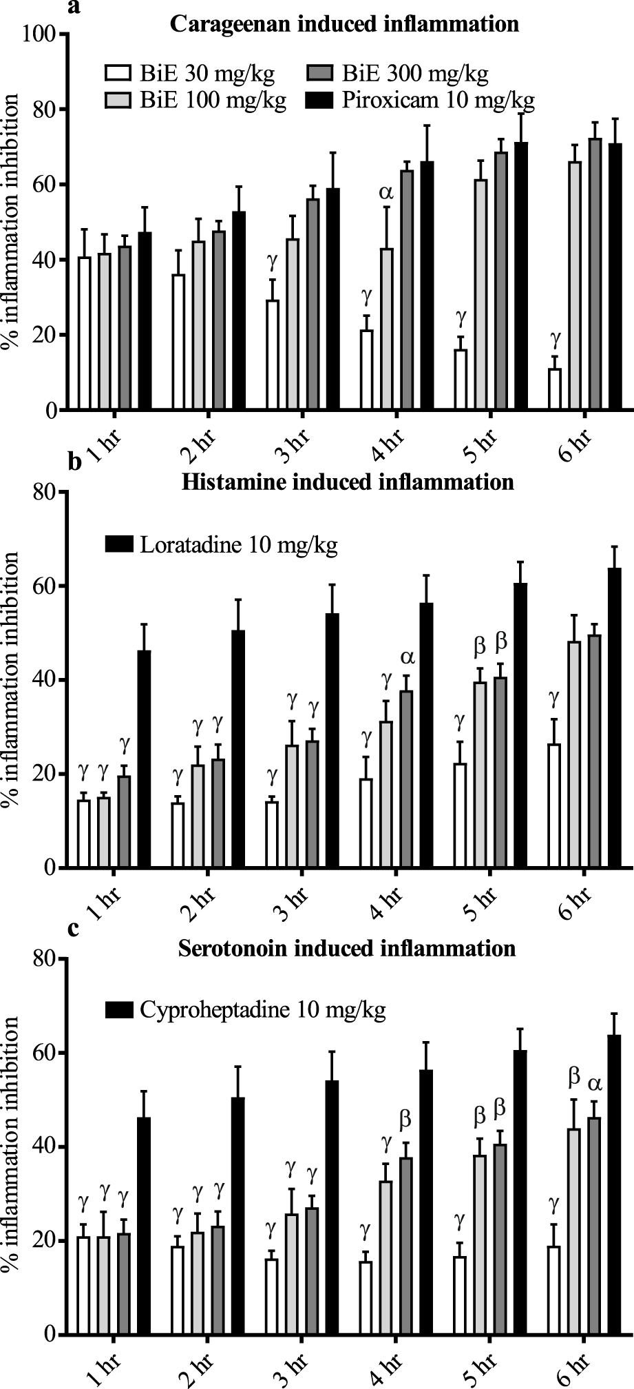 Anti-inflammatory effect of BiE on (a) carrageenan-, (b) histamine-, and (c) serotonin-induced inflammation. Data are presented as the mean ± SEM. Two-way ANOVA followed by Tukey’s test was applied to determine significance among the groups, and BiE effects were compared with those of (a) piroxicam, (b) loratadine, and (c) cyproheptadine. Significance is denoted as α = p < 0.05, β = p < 0.01, and γ = p< 0.001.